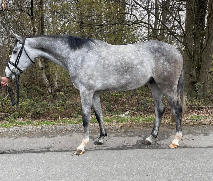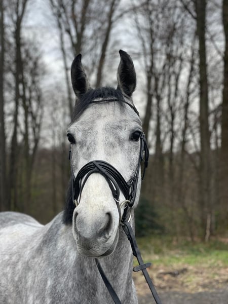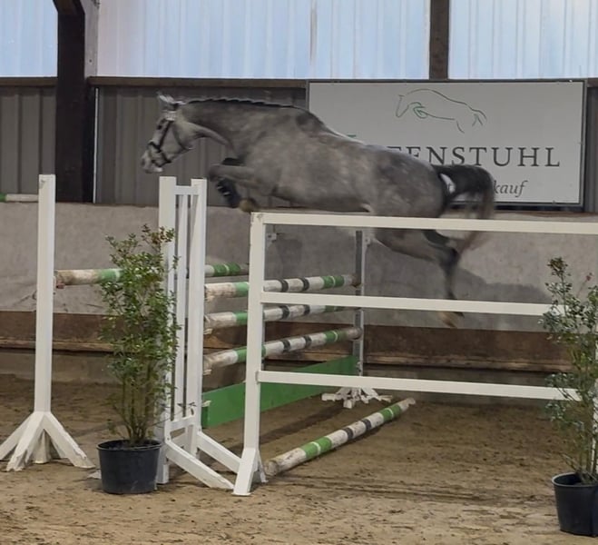 For sale is a promising 4-year-old grey gelding with excellent jumping talent. He has already impressed with a score of 8.0 in a free jumping competition. He is backed and jumps a small course under saddle, consistently showing motivation and plenty of "go." In daily handling, he is straightforward, well-behaved at the blacksmith, and loads easily. Pedigree: Casino Berlin x Contagio. An interesting horse for ambitious riders looking to further develop a talented young jumper. If interested, we look forward to hearing from you.
