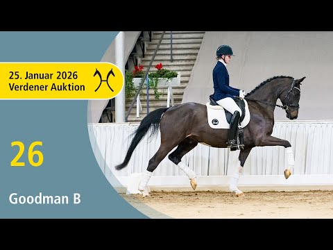 Goodman B zeigt sich mit schöner, naturgegebener Aufrichtung. Formschön im Seitenbild ist er ein reiterlich bestens vorbereiteter Dressurnachwuchs mit guten Nerven. Sein Halbbruder Fred von Feuerstein gehörte zu den begehrtesten Dressurpferden der Verdener Auktion im April 2025 und ist erfolgreich in Aufbauprüfungen des Dressursports. Die Großmutter Salome stellt vier erfolgreiche Nachkommen im Sport, unter anderem Hot Secret v. Secret (DRE: international Grand Prix erfolgreich mit Birgit Wientzek Pläge). 1. Generation Auktionspferde: Fred von Feuerstein v. Fusionist (VA 2025); Ducati v. Dancier (VA 2024); HannPrA Diva v. Damon (VA 2021). 2. Generation Sportpferde Dressur: Hot Secret 3 v. Hotline (DRE: int. Grand Prix mit Birgit Wientzek Pläge,Grand Prix Special -international- 2021,Grand Prix Kür -international- 2021,Grand Prix -international- 2021,GPS - Grand Prix Special 2021,GPS - Grand Prix Special 2019,GP - Grand Prix 2019); Fortuna of Fate v. Floriscount (DRE: M** mit Elisabeth Brendler). Auktionspferde: Dorie v. Da Costa (VA 2023); HannPr Feine Deern/Feine Deern 28 v. Floriscount (VA 2019,Herwart von der Decken-Schau Verden 2018); Quick as Lightning v. Quasar de Charry (VA 2015). Bes. Prämientöchter: HannPrA Fortuna VS v. Falihandro (Herwart von der Decken-Schau Verden 2023); HannPr Roseanne v. Rocky Lee (Herwart von der Decken-Schau Verden 2020); StPr Lady Gaga v. Lauries Crusador (Herwart von der Decken-Schau Verden 2013). 3. Generation Sportpferde Dressur: Luxor 141 v. Lauries Crusador (DRE: S* mit Laura Huch); Lauriger v. Lauries Crusador (DRE: M** mit Christine Hilpert). 4. Generation Sportpferde Dressur: Hawaiianer v. Hotline (DRE: S* mit Julia Sarah Hamberger,FoVA 2009); Domingo 505 v. Davignon I (DRE: S* mit Manfred Herrmann); Davinciano MN v. Danciano (DRE: M* mit Maren Watermann); Donna Diana/Donna Diana 34 v. Davignon I (DRE: M mit Kerstin Mehlis-Nennecke). Sportpferde Springen: Echt Gut v. Earl (SPR: 1,40 m mit Andre Henkel,VA 2009). Aufbauprüfungen Dressur: Latino Dancer 3 v. Laudabilis (DRE: L,VA 2011). Auktionspferde: Step by Step v. Sandro Hit (VA 2003). 5. Generation Bes. Prämientöchter: StPr Wonderful v. Werther. Mutter: Lady Gaga Prämierung: 1xIa. ZL: 10/9 ZSP: Feldprüfung Reitpferd - Trab 7,50 Galopp 8,00 Schritt 7,00 / Durchschnitt Rittigkeit 8,25 / Durchschnitt Springen 7,00 Großmutter: Salome ZL: 14/11 ZSP: Feldprüfung Reitpferd - Trab 8,50 Galopp 8,00 Schritt 8,00 / Durchschnitt Rittigkeit 8,50 / Durchschnitt Springen 6,00 Das Pferd ist ein Verdener Auktionspferd und wird am 25.01.2026 online versteigert. Vom 12.01. bis zum 25.01. kann das Pferd jeden Tag beim öffentlichen Training besichtigt und ausprobiert werden. Das Startgebot bei der Versteigerung ist 8.000 Euro.