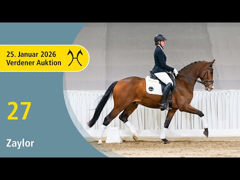 Zaylor ist ein Ausnahmetalent für das Dressurviereck. Mit überdurchschnittlichen Bewegungsanlagen präsentiert er sich formschön im Seitenbild. Sein Halbbruder Downham v. Damaschino I ist mit Jörn Kubelke erfolgreich in Aufbauprüfungen des Dressursports, und Großmutter Henrike stellte die beiden M-Dressur erfolgreichen Sportpferde Flynn v. Finnigan und Fürst Ferdinand v. Fürst Nymphenburg. Die Mutterlinie wird angeführt durch einen gekörten Hengst von Friedrich der Große und durch Ramondo v. Rotspon (DRE: S* mit Benita Katenkamp). 2. Generation Sportpferde Dressur: Flynn 47 v. Finnigan (DRE: M** mit Senna Wagner); Fürst Ferdinand 14 v. Fürst Nymphenburg (DRE: M* mit Juliane Trautmann). gekörte Hengste: gek. Hengst v. Friedrich der Gr v. Friedrich der Große (Verden 2024,FoVA 2022,HM 2024). Auktionspferde: Frédéric v. Friedrich der Große (FoVA 2023); Frieda v. Friedrich der Große (FoVA 2021). Bes. Prämientöchter: HannPr Takmina v. Talisman; HannPr Fiorenza v. Fürst Nymphenburg. 3. Generation Sportpferde Dressur: Ramondo 6 v. Rotspon (DRE: S* mit Benita Katenkamp). Bes. Prämientöchter: StPrA Rubina v. Rotspon. 4. Generation Sportpferde Dressur: Rio Grande 120 v. Rotspon (DRE: S* mit Anouk Wiemers); Fjölvar 3 v. Fürst Belissaro (DRE: S mit Denise Boje). Aufbauprüfungen Springen: Contador 38 v. Comte (SPR: 1,30 m mit Sarah Frank). Auktionspferde: Flashdance v. Fürst Belissaro (FoVA 2017); StPr Resi/Ruby Tuesday 76 v. Riverside (VA 2009,Herwart von der Decken-Schau Verden 2009). Bes. Prämientöchter: HannPrA Fireblade vH v. Friedrich der Große; HannPr Lea v. Livaldon (Herwart von der Decken-Schau Verden 2022); HannPr Baccara v. Buckingham; HannPr Lucia v. Londontime; HannPr Donna Doreen von Issen v. Don Index; StPr Franziska v. Fürst Nymphenburg; StPr Daphne v. Dancier; StPr Sieglinde v. San Remo; StPr Wenke v. Wolkenstein II; StPr Womina v. Wolkenstein II (Louis Wiegels-Schau Sandbostel 1999). 5. Generation Sportpferde Springen: Valkato G v. Valentino (SPR: 1,30 m mit Bjarne Fischer). Aufbauprüfungen Springen: Stallone 24 v. Stakkato (SPR: L); Lucas/Lukas 1026 v. Le Primeur (SPR: L); Stakkata Conti G/Stakkata ContiG v. Stakkato (SPR: L). Auktionspferde: Amadeus-O v. Akatschi (VA 2001); StPr Cyra/Contenance 3 v. Castro (VA 1993). Bes. Prämientöchter: StPr Wilona v. Willem's As. Mutter: Finya ZL: 6/6 Großmutter: Henrike ZL: 14/11 Das Pferd ist ein Verdener Auktionspferd und wird am 25.01.2026 online versteigert. Vom 12.01. bis zum 25.01. kann das Pferd jeden Tag beim öffentlichen Training besichtigt und ausprobiert werden. Das Startgebot bei der Versteigerung ist 8.000 Euro.