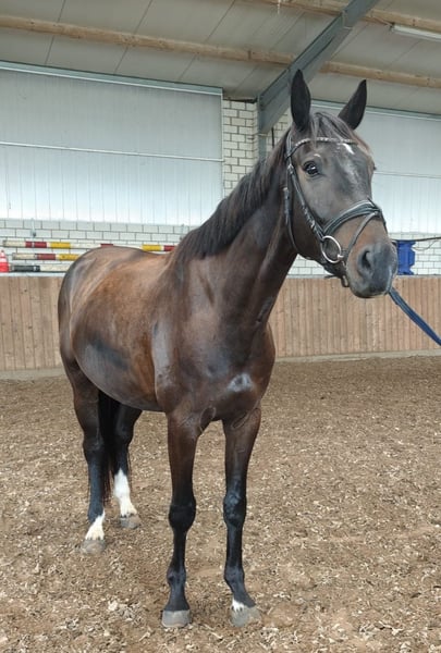 For sale is a great black-brown 4-year-old gelding. He is nice to ride and eager to please in his work. He is currently at the level of a dressage horse A. He has not yet been trained in jumping. He also does great on trail rides. His potential has not yet fully developed due to his growth. Height is approximately 1.69m. He is familiar with everyday farm life, including agricultural machinery, and my little son cannot disturb him with loud shouting. He is barefoot. He has three good basic gaits, with the spacious walk being particularly noteworthy. Pedigree: Sire: Don Romance, Dam's Sire: Charon Due to his age, he is not suitable for beginners or returning riders, as he still needs some security. A veterinary check from last October is available without any findings of risk. He is being sold due to personal changes. This is not an urgent sale! For more information and videos, feel free to contact via WhatsApp at 015202476187.