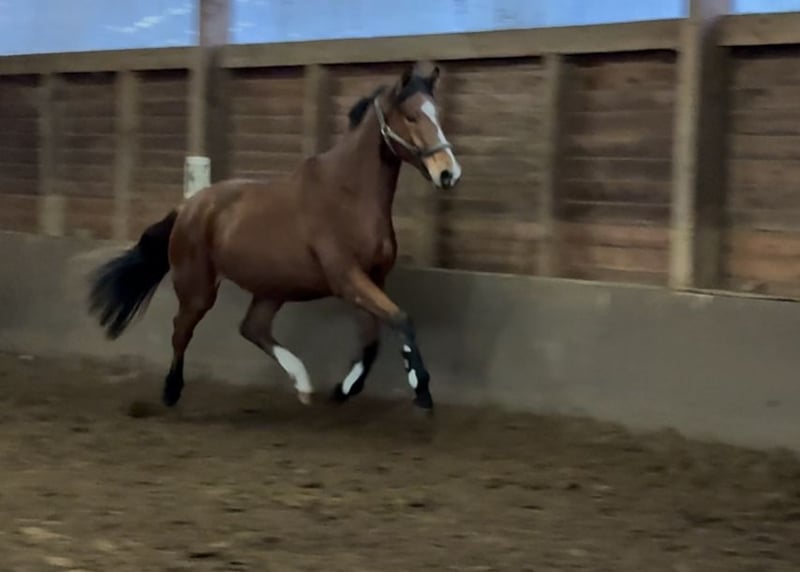 For sale is a 3-year-old bay gelding with an approximate current height of 16.1 hh. He is currently lunged and has a gentle demeanor when handled, working motivated and balanced under saddle. He already moves well in all three gaits and demonstrates good movement with great potential for the future. His pedigree, Fusionist / Shrek xx, suggests athletic ability and a willingness to perform. Ideal for someone looking for a young horse to further develop and train. 📏 Height: approximately 16.1 hh 🎨 Color: Bay 🧬 Pedigree: Fusionist / Shrek xx 📋 TÜV: No current TÜV available