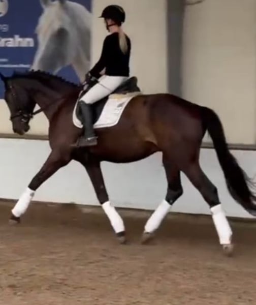 For sale is a lovely 4-year-old dark bay gelding. He is easy to ride and eager to please during work. He moves comfortably in a light contact and is currently competing at dressage horse class A level. He has not yet been introduced to jumping. He also handles trail rides outdoors very well. Due to his growth, he has not yet fully realized his potential. His height is approximately 16.1 hh. He is familiar with everyday farm life, including working around machinery, and even my young son cannot ruffle him with loud shouting. He is barefoot. He has three good basic gaits, with his expressive, ground-covering walk being particularly notable. Sire: Don Romance, Dam: Charon Due to his age, he is not suitable for beginners or reintegration riders yet, as he still needs to gain confidence. A recent veterinary examination from October last year is available, without any risk findings. He is being sold due to personal reasons. This is not a forced sale! Test rides are of course possible at any time. Further information and videos gladly available via WhatsApp at 015202476187.