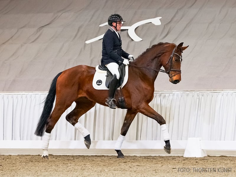 Das Pferd ist ein Verdener Auktionspferd und wird am 18.04.2026 onlive versteigert. Vom 6.04. bis zum 18.04. kann das Pferd jeden Tag beim öffentlichen Training besichtigt und ausprobiert werden. Das Startgebot bei der Versteigerung ist 8.000 Euro. Bildschönes Nachwuchspferd, das sich noch im Reifeprozess befindet. Enrico Caruso zeigt herrliche Ansätze und fordert eine weitere Ausbildung förmlich heraus. Liebevoll aufgewachsen bei seinen Züchtern Ursula und Gerd Lühr in Borgholzhausen, stellt das Züchterhaus mit ihm sein 80. Verdener Auktionspferd. StPr. Bellissima stellte u. a. den gekörten Hengst Lontano v. Londonderry, der mit Birte Flemming in der mittelschweren Klasse des Dressursports erfolgreich war. Ebenso prägen der gekörte Hengst Wolkentanz II v. Weltmeyer (Dressur: intern. S** mit Johannes Westendarp). 1. Generation Auktionspferde: Emely v. Emilio Sanchez (FoVA 2021). 2. Generation Sportpferde Dressur: Florentino 86 v. Fürst Romancier (DRE: M** mit Ronja Schaefer); Sir Sioux v. Santino (DRE: M* mit Lucia Ruch); gek. Hengst Lontano/Lontano 11 v. Londonderry (DRE: M* mit Birte Flemming,Verden 2015). Aufbauprüfungen Dressur: Flavio 64 v. Frascino (DRE: L); Levizzano v. Londonderry (DRE: L,VA 2020); Fürst von Basel v. Foundation (DRE: L); Funkelauge v. Fürstenball (DRE: L). gekörte Hengste: gek. Hengst v. Toto Gold (MS-Handorf 2024). Auktionspferde: Lexington v. Londonderry (VA 2016); Schöne v. Santino (VA 2016); Le Prince v. Londonderry (FoVA 2010); VbPr Schwalbe/Semiramis v. Santino (FoVA 2010); HannPr La Bonita v. Londonderry (FoVA 2009); Starbuck v. Santino (FoVA 2008); La Belle v. Londonderry (FoVA 2006,VA 2013); Lets Dance v. Likoto (FoVA 2003). 3. Generation Sportpferde Springen: Casper L v. Chivas (SPR: 1,30 m mit Vanessa Bölting,Gelände: L,Komb.Vielseitigkeitsprüfung Kl. L - Bundeschampionat 5 jährige 2014). Aufbauprüfungen Dressur: Valero 30 v. Viva Gold (DRE: L,FoVA 2020). Auktionspferde: Bonheur v. Belissimo M (FoVA 2012); Bella Royale/Betty Barclay 14 v. Belissimo M (VA 2014); Romantika/Romantica v. Royal Blend (FoVA 2007); Lindor v. Likoto (FoVA 2004). Bes. Prämientöchter: StPr Lou Wolkentänzerin v. Londonderry; StPr Bellissima v. Brentano II. 4. Generation Sportpferde Dressur: gek. Hengst Wolkentanz II v. Weltmeyer (DRE: int. S** mit Johannes Westendarp,Dressurpf.Bundeschamp.Kl.M 2001,Bundeschampionat f.Reitpferde o.M. 1998,Oldenburg 1997); gek. Hengst Riano/Auheim's Riano v. Rock Forever I (DRE: S** mit Stephanie Dearing,Dressurpferdeprüfung -international- WM 6 jährige Kl. M 2015,Dressurpferdeprüfung -international- WM 5 jährige Kl.M 2014,Vechta 2011); Rosmarin 8 v. Rosentanz (DRE: S** mit Kimberly Herslow); gek. Hengst Ballettmeister v. Brentano II (DRE: S** mit Iryna PANCHENKO,Adelheidsdorf 2006); Right Forever v. Rock Forever I (DRE: S* mit Ingrid Klimke); Belmondo 187 v. Belissimo M (DRE: S* mit Angelika Grest,VA 2015); StPrA Beyonce/Beyonce OLD v. Belstaff (DRE: M mit Sergio NAVARRO VICENTE). Aufbauprüfungen Dressur: StPrA Fiesta Danza/Fiesta Danza OLD v. Fürstenball (DRE: M mit Bianca Nowag-Aulenbrock,Bundeschampionat f. Reitpferde 2015,Finalteilnehmer Bundeschampionat 3j.Reitpferde 2015); Dagobaz 5 v. Da Vinci Code (DRE: L). Besondere Sportergebnisse: gek. Hengst Wolkentanz/Wolkentanz 2 v. Weltmeyer (Bundeschampionat f.Reitpferde o.M. 1994,Verden 1993,HM 1993,Sieger Körung Verden 1993,Bester Hengst des Jahrgangs 1995). gekörte Hengste: gek. Hengst Take That/Take That 8 v. Totilas (Verden 2021,HM 2021: 370.000 €); gek. Hengst v. Fürst William v. Fürst William (Verden 2019); gek. Hengst Be my Hit v. Benicio (Verden 2019,HM 2019); gek. Hengst Don Luxury v. Don Deluxe (Vechta 2018); gek. Hengst v. Spörcken v. Spörcken (Verden 2015,HM 2015: 55.000 €,Prä.Dre. Körung Verden 2015); gek. Hengst v. Sir Donnerhall II (Vechta 2012). Auktionspferde: Luxusliner 2 v. Londonderry (VA 2009). Bes. Prämientöchter: HannPrA Butterfly v. Belissimo M; StPr Samanta Fox v. Sandro Hit; StPr Bonny M v. Brentano II; StPr Bella Donna/Bella Donna 75 v. Brentano II; StPr Weisse Rose v. Weltmeyer (Ratje Niebuhr-Schau Verden 1994,Louis Wiegels-Schau Filsum 1995). 5. Generation Sportpferde Springen: Carlos HH v. Christiano (SPR: 1,35 m mit Vanessa Bölting,VS: int. M mit Vanessa Bölting); Gustavo 11 v. Graf Top (SPR: 1,30 m mit Stephan Engelbert Gieseking); Galando 20 v. Graf Top (SPR: 1,30 m mit Stefan Miß,VA 2008). Sportpferde Vielseitigkeit: Carlos HH v. Christiano (SPR: 1,35 m mit Vanessa Bölting,VS: int. M mit Vanessa Bölting). Aufbauprüfungen Dressur: Webdesigner v. Wind Dancer (DRE: M mit Markus Funk); BezPr Mathilda G/Grossi's Mathilda v. Alcatraz (DRE: L). Aufbauprüfungen Gelände: Catalunia HH v. Conteur (Gelände: L). Besondere Sportergebnisse: Ibikon's Quanto Costa v. Quaterback (Championat f. Reitpferde 2012). Auktionspferde: Gold and Silver v. Graf Top (FoVA 2009); Gilmore Girl v. Graf Top (FoVA 2007); Ginger/Ginger 795 v. Graf Top (VA 2009); Lilly/Liebe v. Londonderry (FoVA 2000). Bes. Prämientöchter: StPr Dynamik v. Dobrock; StPr Lovely v. Ludendorff. Mutter: La Luna Prämierung: 1xIa. ZL: 6/5 Großmutter: Bellissima Prämierung: 4xIa. ZL: 18/13 ZSP: Feldprüfung Reitpferd - Trab 7,00 Galopp 7,00 Schritt 7,00 / Durchschnitt Rittigkeit 7,00 / Durchschnitt Springen 7,50