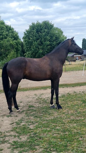 Felino is a 4-year-old, large-framed, black-brown Hanoverian gelding standing at 1.78m. He is sired by Finest, out of a World Fame mare. He was born and raised in my stable. In handling, he is a true gem. Veterinary visits, farrier appointments, loading, trailer rides, or going for walks are no problem for him. He always wants to please. Children and dogs around him are a given. In terms of riding, Felino has not been extensively trained yet. He was backed as a 3-year-old and then had another break. At the beginning of the year, he was re-trained, but unfortunately, he has only been ridden very inconsistently since then, as I have very little time due to my children and daily life. Currently, he has been standing for about two months. Due to his low level of training, Felino needs a rider who can provide him with security while also being consistent. Felino has a mild form of equine asthma, which has almost disappeared here with optimized housing. Of course, Felino has been regularly vaccinated and dewormed, has been presented to the veterinarian for dental care, and has also seen the farrier. The decision to part with Felino has not been easy for me; however, I simply cannot do him justice anymore, and I don’t want him to just stand around in the pasture. Therefore, I am looking for a new home for him where he will be challenged and supported, and not just left to stand around.