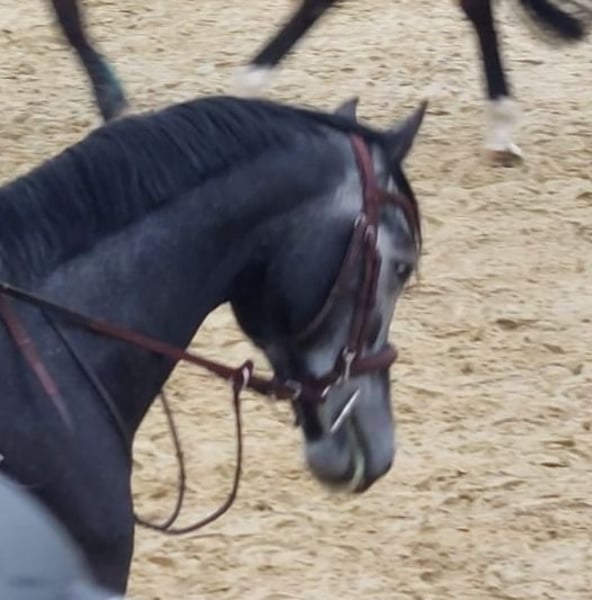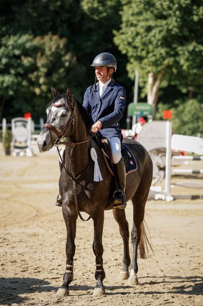 Bred at Gestüt Machbach until the age of 3. Very well-handled and human-oriented. Suitable for someone willing to give him a bit more time. He has a large, expressive canter but is not yet strong enough to maintain the gait consistently. This year, he has competed in Springpferde A* classes (7 rounds) and has already been placed with a score of 7.8. Under saddle, he can sometimes be a bit shy and needs a patient rider who can help him feel secure. Please feel free to contact us for further questions.