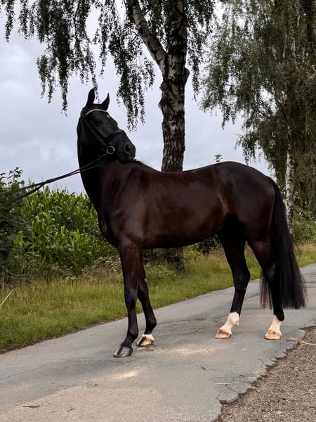 For Sale: Hanoverian Gelding A stunning Hanoverian gelding born in 2021 is available. Standing approximately 16.2 hh, he is the perfect partner for dressage enthusiasts. **Features:** - Breed: Hanoverian - Gender: Gelding - Year of Birth: 2021 - Color: Black (Rappe) - Height: 16.2 hh - Suitability: Dressage This talented gelding impresses not only with his expressive appearance but also with his excellent movements and willingness to learn. He is well-mannered, easy to handle, and ready for the next steps in his training. Additionally, he demonstrates a very good obedience jump under saddle, although this has not yet been fully developed. If you are interested or require further information, please do not hesitate to contact me. Don’t miss this opportunity!