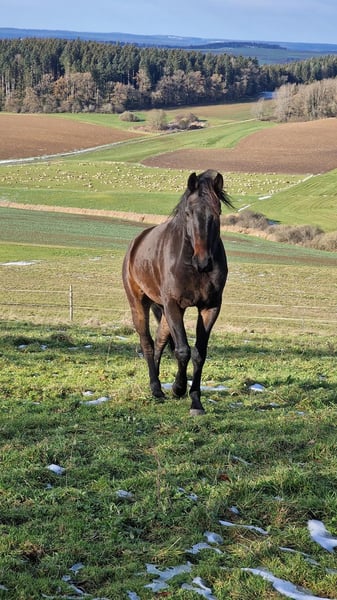 For sale is Fin (Financier), a 5-year-old dressage-trained Hanoverian gelding in elegant dark brown coat. ✨ Key data: Age: 5 years Gender: Gelding Breed: Hanoverian Color: Dark brown Height: approx. 1.65 m Description: Fin impresses with his beautiful conformation, clear mind, and willingness to learn. He was gently backed at the age of 3 and has primarily been trained in the field. There, he consistently shows reliability, strong nerves, and is a true dependable horse. In dressage, Fin is already trained to a good level and has the potential to be further developed, providing joy in both sport and leisure. In addition to classical work under saddle, he is trained in groundwork and free work, making him a particularly versatile partner. 🐴 Special features: Used to open stabling and loves this form of housing Barefoot Calm for the farrier and loading Versatile: Dressage, jumping, trail riding, groundwork & free work Fin is now looking for a loving home where he can continue to be developed and prove his qualities as a reliable, versatile partner. 📍 Location: 78073 (Ba-Wü) 💰 Price: 15,000 negotiable ‼️ Sale due to health reasons – with a heavy heart. ➡️ If interested, please get in touch – videos & further information available upon request!