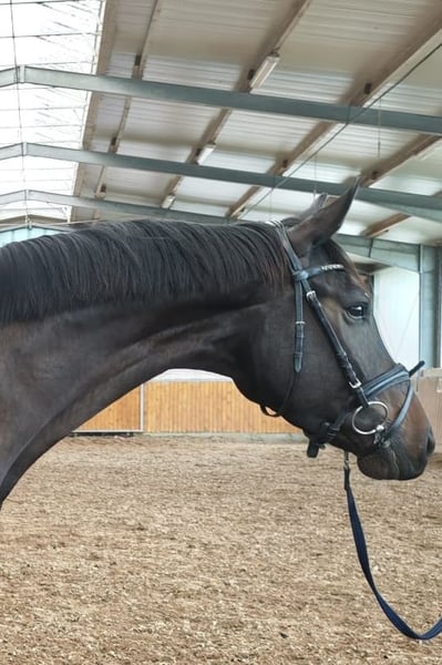 For sale is a lovely 4-year-old dark bay gelding. He is easy to ride and eager to please during work. He moves comfortably in a light contact and is currently competing at dressage horse class A level. He has not yet been introduced to jumping. He also handles trail rides outdoors very well. Due to his growth, he has not yet fully realized his potential. His height is approximately 16.1 hh. He is familiar with everyday farm life, including working around machinery, and even my young son cannot ruffle him with loud shouting. He is barefoot. He has three good basic gaits, with his expressive, ground-covering walk being particularly notable. Sire: Don Romance, Dam: Charon Due to his age, he is not suitable for beginners or reintegration riders yet, as he still needs to gain confidence. A recent veterinary examination from October last year is available, without any risk findings. He is being sold due to personal reasons. This is not a forced sale! Test rides are of course possible at any time. Further information and videos gladly available via WhatsApp at 015202476187.