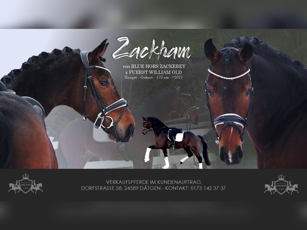 A CHARMING MOVEMENT ARTIST – HIGH QUALITY AND DREAMY CHARACTER – APPROVED AND PERFORMANCE TESTED – MULTIPLE PLACEMENTS IN RIDE HORSE AND DRESSAGE HORSE A WITH SCORES UP TO 9.0 – SIRE FROM ZG WERTH – WITH GREAT POTENTIAL FOR THE BIGGER ARENA – SUITABLE FOR JUNIORS! For sale on behalf of the owner is this 172 cm tall, dark bay, 5-year-old, licensed and performance-tested Hanoverian stallion. He is by BLUE HORS ZACKERY out of FÜRST WILLIAM OLD, and his pedigree promises a bright future. He is currently used for breeding but can also be gelded upon request. "ZACKHAM" immediately impresses with his harmonious build, modern high-quality conformation typical of sport horses, a beautiful head, and his charming personality that catches everyone's eye. When "ZACKHAM" moves, his exceptional potential becomes evident, combined with an angulation that already hints at a future Grand Prix competitor. Elasticity, shoulder freedom, impulsion, mechanics, hindquarters, contact, uphill tendency, and strength of frame are all present. He develops all of this from a very well-angled, active hind leg, which transmits movement through a swinging back and a good scope, with a lovely free shoulder. Since starting under saddle, "ZACKHAM" has been in professional training and is currently at dressage horse level L, with M-level movements already being worked on (flying changes, travers). He also shows great talent in playful work with half-steps. His track record is impressive. Not only is he licensed, but he has also been placed multiple times in Reitpferde and Dressurpferde A tests and has passed performance testing (short VA test). A current, thorough clinical and radiological examination (standard plus neck and back X-rays) is available. After purchase, "ZACKHAM" would be very happy to remain in professional training with us for further development and competition, including international FEI events.