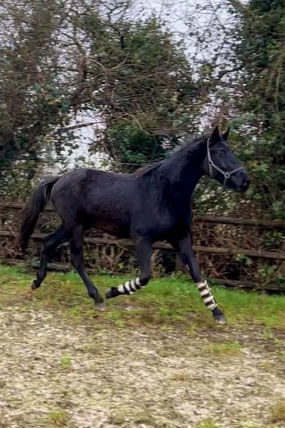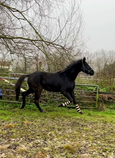 Black gelding Total Surprise by Total Hope out of the state premium mare K.C. Surprise, born 16.7.21, dressage-oriented, expected final height 172 cm. Price reduced due to a houndstooth mark on the left rear, which is only visible when walking, trot and cancer are very good and flawless. ideal for leisure riders who enjoy good dressage without participating in competitions