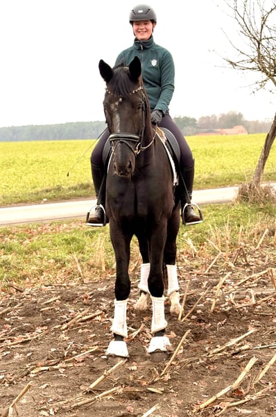 Wallach von Bon Joker - Swarovski, 4 Jahre, 177 cm, Bildhübscher und charmanter Wallach vom Oldenburger Prämienhengst Bon Joker. Sehr unkompliziert und umgänglich, lerneifrig, mit lockerer, schwungvoller Bewegung und guter Qualität in allen drei Grundgangarten. Gelände sicher .Im Pedigree finden sich mit Bon Coeur, Fürstenball, Sandro Hit und dem Elitehengst Caprimond sehr bedeutende Dressurvererber wieder. Direkt vom Züchter mit turniererfolgreichen Geschwistern, ausgebildet auf Dressurpferde-A-Niveau. Bereits getüvt.“ Bei Fragen bitte per WhatsApp oder telefonisch 01602428444