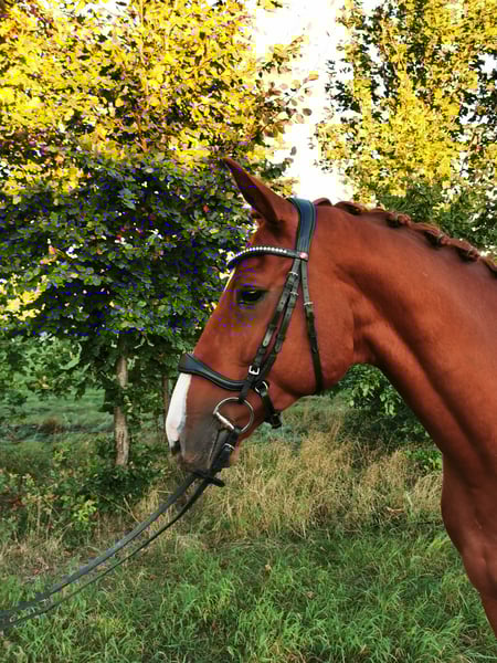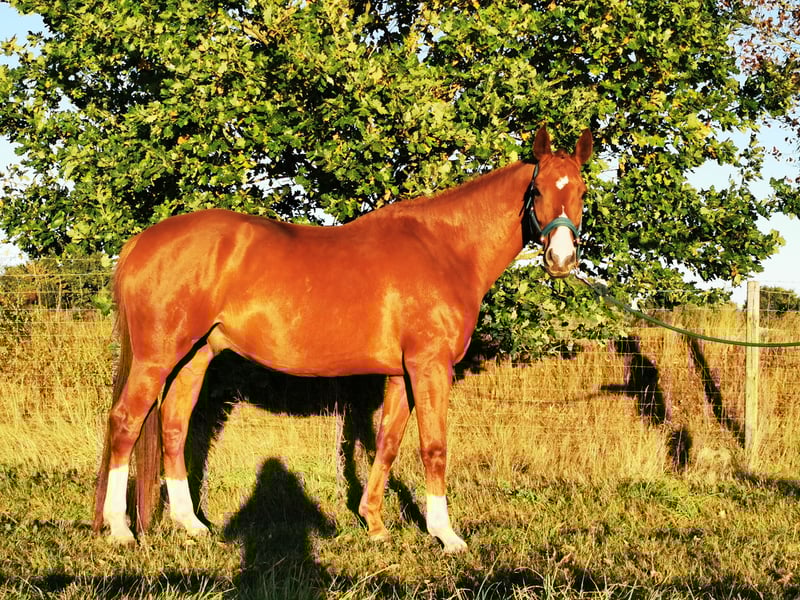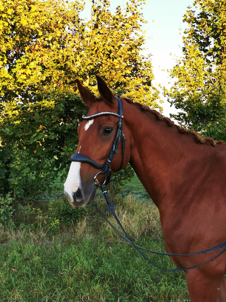 This 6-year-old Hanoverian is a beautiful colorful dark chestnut gelding with a height of approximately 1.67 m by Destano - Desperados x Don Frederico - Rubinstein I. He impresses not only with his finest dressage bloodlines but also with his great work ethic: the video with the white saddle pad was taken after a 3-week break. He is simply fun to ride! The second video was taken when he was 5 years old after 4 weeks of training; he was given time for physical development beforehand. With a lively, rhythmic movement and lightness in the hand, he was worked at a solid A-level last year and is now starting his very first L-level exercises. Due to his lineage, he finds balance and self-carriage easy. He has enough enthusiasm but is by no means too spirited in the arena and responds excellently to voice and breathing cues. As part of his initial training, he has jumped a small E-course. During the horse handler license training, he patiently practiced groundwork with children; he is also familiar with bridges and tarps. He works without side reins (also on the lunge) with children and less experienced riders in the arena and indoor riding hall - here, Olaf easily forgives mistakes. He adapts to the rider's level in the arena. He is familiar with trail rides alone and in groups under experienced riders at A-level, as he still needs security from above on unfamiliar routes due to his age. Olaf is very traffic-safe (including large agricultural machinery) and also goes through water. He is, of course, familiar with strange places and indoor arenas. He has not yet been presented at competitions. Absolutely gentle when being sprayed, washed, with the veterinarian, farrier, loading, and in daily handling. He is barefoot. He knows open stabling and paddock boxes. Olaf would certainly be very suitable for an ambitious leisure rider with a focus on dressage, as a family horse for experienced individuals, or for good riding schools.