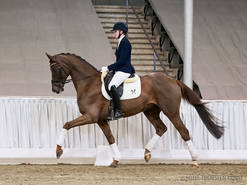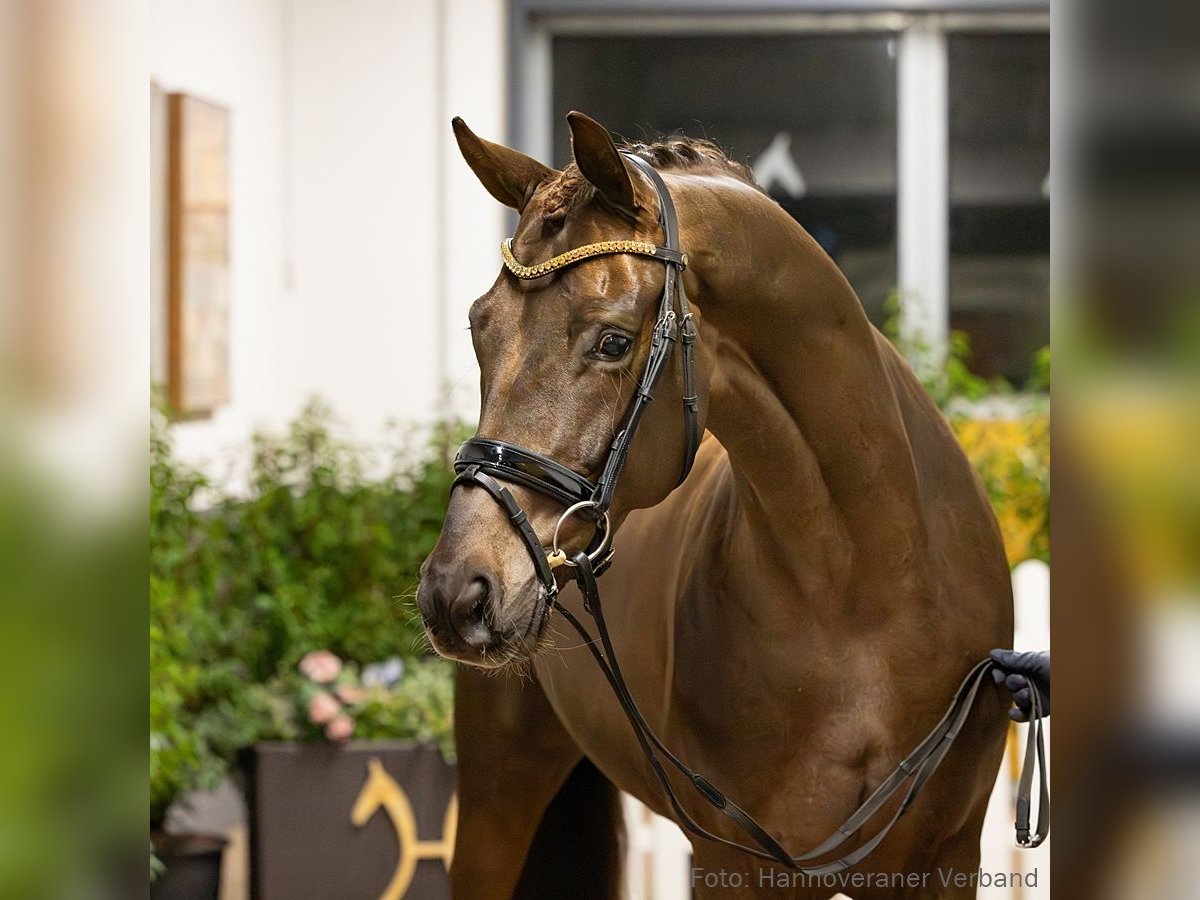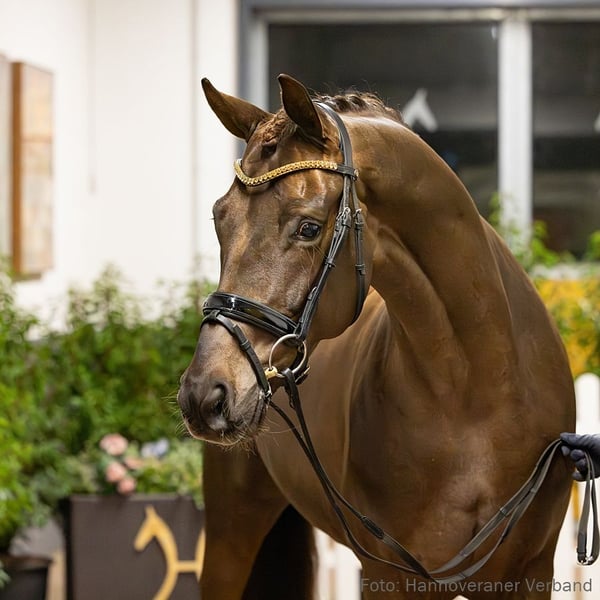 Das Pferd ist ein Verdener Auktionspferd und wird am 18.04.2026 onlive versteigert. Vom 6.04. bis zum 18.04. kann das Pferd jeden Tag beim öffentlichen Training besichtigt und ausprobiert werden. Das Startgebot bei der Versteigerung ist 8.000 Euro. HS Le Chiffré präsentiert sich typstark und entstammt einer erfolgreichen Zucht. Mit einem bereits gut gefüllten Erfolgskonto erscheint seine Zukunft mehr als vielversprechend. Er siegte in einer Reitpferdeprüfung und platzierte sich hoch in Dressurpferdeprüfungen der Klassen A und L unter Ann Kathrin Müller. Großmutter StPr. Warina SH brachte die beiden gekörten Hengste Mr Bojangles v. Benetton Dream und Laurent v. Lauries Crusador xx hervor. Urgroßmutter StPr. Bonny ist zudem Mutter des gekörten Hengstes Wonderful v. Weltmeyer. Das Pferd wird abweichend von den Auktionsbedingungen mit eingeschränktem Versicherungsschutz verkauft. Bitte erkundigen Sie sich bei der Auktionstierärztin. Sportname: HS Le Chiffre Sporterfolge: RPF: 1/1. DPF: A 1/2. 2/3. 1/4. 2/w. L 1/2. 1. Generation Aufbauprüfungen Dressur: Found a Dream 3 v. For Final (DRE: int. L). 2. Generation Aufbauprüfungen Dressur: Davy Jones 8 v. Don Henrico (DRE: L). gekörte Hengste: gek. Hengst Mr Bojangles v. Benetton Dream (England 2014); gek. Hengst Laurent/v. Lauries Crusador (Verden 2004,HM 2004,Endring 7. Körung Verden 2004). Auktionspferde: Deininger 2 v. Desperados (VA 2016). 3. Generation Sportpferde Dressur: LS-Dr Future of W v. Fürstenball (DRE: int. M** mit Anna Nesheim,Finalteilnehmer Bundeschampionat 3j.Reitpferde 2016,VA 2018: 125.000 €); Dance Monkey 9 v. Dancier (DRE: S*** mit Patrick Meyn,VA 2021); Deauville S 3 v. Dante Weltino (DRE: S** mit Daniela Hacheney); Fizz Caraldo v. Forrest (DRE: S** mit Schulte-Fischedick,Rolf Dr.,Dressurpf.Bundeschamp.Kl.L 1993); Golden Fire W v. Governor (DRE: S* mit Frode Nesheim,VA 2025: 110.000 €); Dr. Who 5 v. Dr. Watson (DRE: S* mit Martina Binnenbrücker); gek. Hengst Symphonic/Symphonic 2 v. Sir Heinrich (DRE: S* mit Stefanie Ahlert,MS-Handorf 2014); StPr Rosenrot T v. Royal Classic (DRE: S* mit Nadine Venhaus); Raffaello Santi S v. Rock Forever I (DRE: S mit Antje Tepel,Deutsches Amateur-Championat Dressur 2022); Washington T v. Weltmeyer (DRE: M** mit Paul Hackl,VA 2004); Promotion 10 v. Pik Junior (DRE: M** mit Ev Siegle); Ricardo S 3 v. Rock Forever I (DRE: M* mit Nina Gawronski); HannPrA Fiesta Mexicana/Fiesta Mexicana T v. Follow Me (DRE: M* mit Florian Tüpker,Herwart von der Decken-Schau Verden 2017); StPr Seraphina W v. Sir Donnerhall I (DRE: M* mit Patrick Klein); Rubello v. Rubinstein I (DRE: M mit Pia Piotrowski); Winona 30 v. World Class (DRE: M mit Cornelia Metz). Sportpferde Springen: Federweißer v. Wendig (SPR: int. 1,40 m mit Ingo Butter); Weihnukka v. Weltmeyer (SPR: 1,30 m mit Matthias Mohr). Aufbauprüfungen Dressur: Eminem T 3 v. Emilio Sanchez (DRE: M mit Florian Tüpker); Santano 120 v. Sunny-Boy (DRE: M mit Christine Räuber); gek. Hengst Wonderful/Wonderful 25 v. Weltmeyer (DRE: M mit Baumgart,Hannes,Verden 1991,HM 1991,Reservesieger Körung Verden 1991); HannPrA Ext+ Emilia/Emilia 79 v. Erdinger (DRE: L); Symphonic A v. Sir Heinrich (DRE: L); Be Happy T v. Buckingham (DRE: L); Fräulein Wunder W/Fräulein Wunder W 2 v. Follow Me (DRE: L,VA 2019); Ratzfatz S v. Rock Forever I (DRE: L); VbPr Busy Lizzie/Busy Lizzie 2 v. Belissimo M (DRE: L); Richard Löwenherz 17 v. Retoucheur (DRE: L); Let's Twist Again T v. Lord Sinclair I (DRE: L); Walton 5 v. Warkant (DRE: L); Laurent-Perrier 2 v. Lauries Crusador (DRE: L). Aufbauprüfungen Springen: Fynn 8 v. Wendig (SPR: L). gekörte Hengste: gek. Hengst v. Bonds (MS-Handorf 2025); gek. Hengst v. Vitalis-Fürstenb v. Vitalis (Verden 2024); gek. Hengst Zackham v. Zackerey (Redefin 2023); gek. Hengst Libori/Libori 2 v. L' Espoir (MS-Handorf 2012). Auktionspferde: Dantina W v. Danciano (VA 2017); Nightlife W v. Negro (VA 2018); HannPrA Fascination W v. Foundation (VA 2016); Ray of Light W v. Romanov Blue Hors (VA 2015); Herzbube 78 v. Hofrat (VA 2012); Wilkerson v. Weltmeyer (FoVA 2008); Weltfürst v. Weltmeyer (FoVA 2007); Bonny/Bonny 97 v. Brentano II (FoVA 1991). Bes. Prämientöchter: HannPrA Easy Peasy/Easy Peasy T v. Emilio Sanchez; HannPrA Ruby Tuesday/Ruby Tuesday T. v. Royal Classic (Herwart von der Decken-Schau Verden 2016); StPr Wunderschöne T v. Weltmeyer (Herwart von der Decken-Schau Verden 2012); StPrA Fürstin W v. Fürst Grandios; HannPrA Florenciana W v. Florenciano; StPr Wind of Change W v. Windspiel As; StPr Dame Rouge T v. Don Frederico (Herwart von der Decken-Schau Verden 2007); StPr Wolke Sieben T v. Weltmeyer; StPr Warina SH v. Wittinger; StPr Brentania/Bacalena v. Brentano II; StPr Krönchen/Kronprinzessin 2 v. Kronenkranich. 4. Generation Sportpferde Dressur: DMJ Lagoni v. Lauries Crusador (DRE: int. S* mit Lennart Steindl,Nationenpreis Dressur Kl.S Junge Reiter -international- 2019); gek. Hengst Riccione/Riccione 7 v. Regazzoni (DRE: S** mit Melanie Hofmann,Europameistersch.JR Dressur -Mannschaft- 2010,Verden 1998,HM 1998: 175.000 €); Einzigartig v. Escolar (DRE: S** mit Jana Lang); Frederico 39 v. Fürst Heinrich (DRE: S** mit Marion Wiebusch); Sternenzauber v. Sir Donnerhall I (DRE: S** mit Kai Rüder); Horrido 27 v. His Highness (DRE: S** mit Emma Kanerva); gek. Hengst Quintus 202 v. Quantensprung (DRE: S* mit Carlotta Maria Ritscher,Verden 2019); Daddy's Daylight v. De Niro (DRE: S* mit Leonie Bartling); Fidertraum 2 v. Fidertanz (DRE: S* mit Natalie Weigel); Roi du Monde v. Rousseau (ex: Rambo) (DRE: S* mit Jan Disterer); Lausbub 267 v. Lemon Park (DRE: S mit Behrendt,Ralph); HannPrA Serenade/Saphirblau v. Scuderia (DRE: M** mit Esther Maruhn); Woodini 3 v. Weltmeyer (DRE: M** mit Hans-Peter Bosch); Rainbowdancer v. Rubin-Royal (DRE: M** mit Sandra Bartels); Bon Ami Noir v. Bon Coeur (DRE: M* mit Anja Reuter); Diamond's DiDonato v. Diamond Hit (DRE: M* mit Denise Schoberth); Sunrise enjoy v. Sandro Hit (DRE: M* mit 