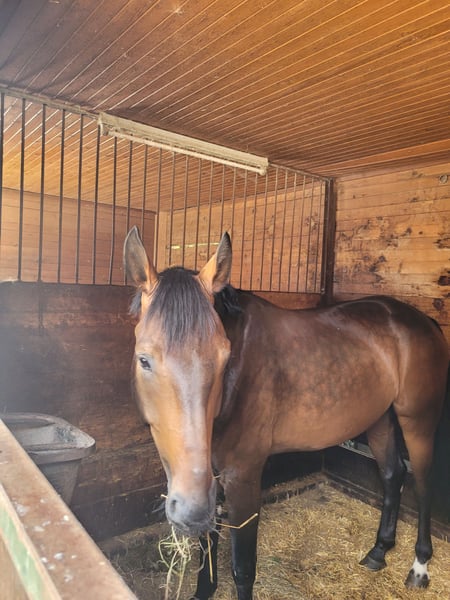 Leider muss ich mich von meinem 2019 geborenem dunkelbraunen Hannover Wallach trennen. Er ist 171 cm groß. Donizetti hat eine tolle Abstammung, Dressur gezogen. Er ist ein sehr neugieriger und lieber Kerl. Treten und Beissen kennt er nicht. Beim Schmied und beim Verladen absolut brav. Er wird wegen einem Befund im Rücken günstig abgegeben. Donizetti benötig einen Erfahrenen Reiter der ihm regelmäßiges Training bieten kann. Leider habe ich zu wenig Zeit um dies zu gewährleisten. Er ist auch kein Pferd zum aufsteigen und losreiten. Leider dürfte er in seinem Leben schon schlechte Erfahrungen gemacht haben und benötigt daher erst das Vertrauen zu seiner Bezugsperson. Er war von April bis Mai im Beritt und zeigte sich dort sehr vorbildlich. Dort wurde er nur am Platz geritten. Im Gelände gibt es leider keine Erfahrungen. Beim spazierengehen ist er aber sehr brav. Er kennt alles was auf einem Hof so rumläuft und fährt. Hat keine Probleme mit Kindern oder Hunden. Er benötigt nur vorne einen Beschlag. Er ist regelmäßig geimpft und entwurmt. Die Zähne wurden im Mai gemacht. Auf wunsch kann er gerne mit seinem Sattel auziehen. Dieser wurde im Mai vom Sattler neu angepasst und neu gepolstert. Da er fremden Personen gegenüber skeptisch ist, ist ein Probereiten nicht möglich. Wir haben auch keinen Reitplatz oder Halle. Eventuell kann ein Termin mit seiner Trainerin vereinbart werden das sie ihn vorreitet. Weitere Informationen kann ich gerne telefonisch geben.
