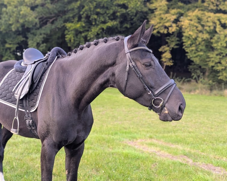 With a heavy heart, I must part with my 6-year-old Hanoverian, Valerio. Horse Data: DOB: April 2019 Gender: Gelding Color: Black-brown Breeding Area: Hanover Pedigree: Sire: Vidar (by Viscount) Dam: Roxana Dam's Sire: Rock Forever I (by Rockwell) I purchased him unbacked in December 2021 with a comprehensive vet check (X-rays available) directly from the breeder. On the ground and in handling, he is absolutely sweet and relaxed. He is also always cautious with children. He is familiar with walks in the woods and many other activities through lunging or small jumps in hand. Unfortunately, he has not become the reliable horse I had hoped for when riding. Valerio is ridden (walk, trot, canter) and is already familiar with poles and cavalettis with a rider. However, he currently has a problem with mounting, which is why he is not being ridden at the moment, and trial rides are also not possible. Valerio needs a rider with a lot of experience, calmness, and patience to help him regain trust with the rider. Then he will surely become a great sport or leisure partner. Since he has been in my possession, he has been barefoot and has no further vices or illnesses. He is accustomed to box housing with daily turnout in a mixed or purely gelding herd.