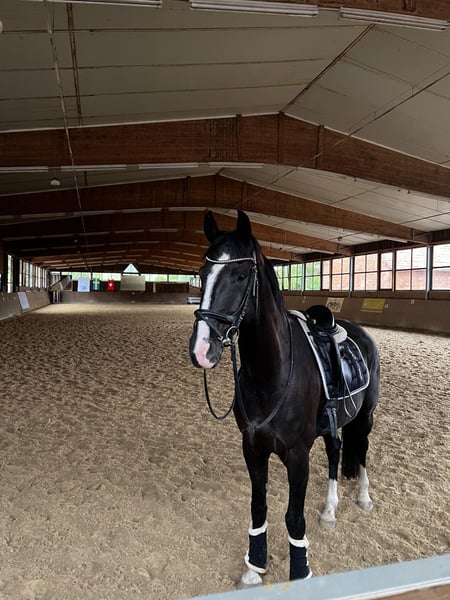 This super gentle and very rideable 6-year-old Hanoverian gelding by the S-Dressage series winner Emilio Sanchez out of a D-Online-De-Niro mother was bred by us. He is looking for his person or family to bring a lot of joy to. After much back and forth and obtaining a second opinion, he is now being sold well below his value. Unfortunately, a small bone cyst was discovered during a vet check, which has never affected him. The further vet check was clinically clear. Eniro is in top shape. He was gently backed at the age of 3 and had a break typical for young horses. He performs solidly in all three gaits in the arena as well as in the field, both alone and in a group, and at any position. He regularly travels in a trailer and behaves trustfully and very kindly in unfamiliar places. Eniro is barefoot without any issues; he is familiar with dogs, tractors, and trucks, and can be ridden by larger children without any problems. However, they should be of a height suitable for a horse measuring 1.74 m and should already be able to ride. I wish for him to have a wonderful home where he will continue to be developed as a riding horse – as a competition horse, as a great family horse for mother-daughter pairs, or with a demanding leisure rider. Occasional trail rides should of course not be missed. Elmo is 1.74 m tall and has been in my possession since birth. I will only give him to the very best hands and would like to maintain contact with him.
