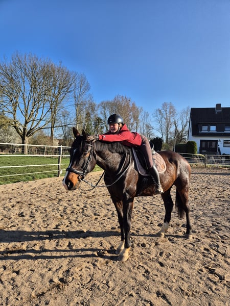 Ich verkaufe aufgrund Bestandsverkleinerung meinen mit drei schwungvoll ausgestatteten GGA, lieben, braunen 6 jährigen Hannoveraner-Wallach. Ich habe ihn als Absetzer gekauft und bei mir im Offenstall aufgezogen. Er wurde im Frühjahr 2025, aufgrund seiner Größe erst recht spät, schonend angeritten. Er zeigt sich seitdem als sehr lernwillig, leichtrittig und leicht an den Hilfen. Ihn zeichnet seine hervorragende Arbeitseinstellung aus, an welche auch nach mehrwöchiger Pause ohne jegliches Bocken angeknüpft werden kann. Er läuft solide alle drei GGA, lernt aktuell die ersten Seitenlänge, zeigt sich im Freispringen motiviert und wird aktuell auch unter dem Reiter an die ersten Sprünge herangeführt. Im Gelände zeigt er sich in der Gruppe brav und unerschrocken. Er kennt es auf unterschiedlichen Anlagen geritten zu werden und meistert auch dieses mit Bravour. Harry wartet auch ohne Probleme alleine auf dem Anhänger. Beim Verladen ist er ein absoluter Profi - auch bei Dunkelheit kein Problem. Harry ist ein sehr menschenbezogenes Pferd, welches den Kontakt mit Kindern und landwirtschaftlichen Maschinen gewöhnt ist und dem Menschen grundsätzlich gefallen möchte. Er ist im Handling ein absoluter Schatz. Durch seine bisher recht kurze Reitkarriere sehe ich ihn aktuell noch nicht als Anfängerpferd. Mit einem feinen, selbstbewussten Menschen ist er ein Pferd mit großem Potenzial für die gehobene Freizeitreiterei. Ich kann ihn mir auch in dieser kommenden Saison schon auf Turnieren vorstellen. Ich wünsche mir eine liebevolle Person, die Erfahrung in der weiteren Ausbildung und dem Umgang mit Jungpferden hat. Da er auf der Weide geboren wurde und seitdem bei mir im Offenstall steht, wünsche ich mir auch weiterhin eine Paddock und Weidehaltung für ihn. Bei ernsthaftem Interesse gerne melden. Videos auf Anfrage per WhatsApp möglich. Kein Notverkauf - wird nur verkauft, wenn alles passt. Probereiten nach Absprache möglich. Hierfür werden 30€ berechnet, welche jedoch bei einem Kauf angerechnet werden. Abstammung: Emilio Sanchez x Don Henrico Größe: 1,78m
