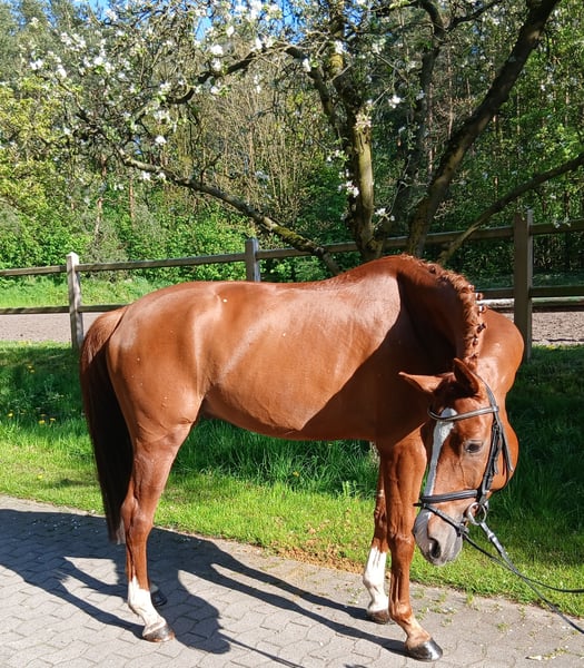 Tai is a very charming and friendly young horse. Bloodlines and very elegant. Gently backed and directly from the breeder, all doors are open to him. He is very comfortable and soft in the hand, always has a good forward movement, and is eager to work. He is also very easy to sit. We see him as a lovely horse for transitioning or for ladies. Since he is a bit more delicate and smaller, he was backed at the end of his fourth year. He has not yet been exposed to competition atmosphere. He enjoys hacking out, preferably in company. A very recent health certificate is available! Absolutely herd-proof. No prior health issues. Please call or message directly at 0172 8694703.