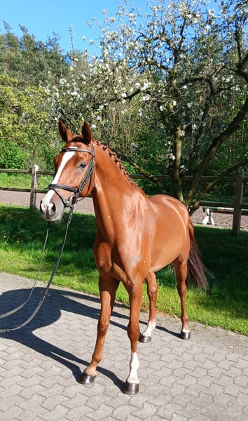 Tai is a very charming and friendly young horse. Bloodlines and very elegant. Gently backed and directly from the breeder, all doors are open to him. He is very comfortable and soft in the hand, always has a good forward movement, and is eager to work. He is also very easy to sit. We see him as a lovely horse for transitioning or for ladies. Since he is a bit more delicate and smaller, he was backed at the end of his fourth year. He has not yet been exposed to competition atmosphere. He enjoys hacking out, preferably in company. A very recent health certificate is available! Absolutely herd-proof. No prior health issues. Please call or message directly at 0172 8694703.