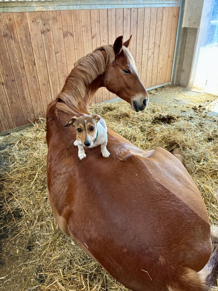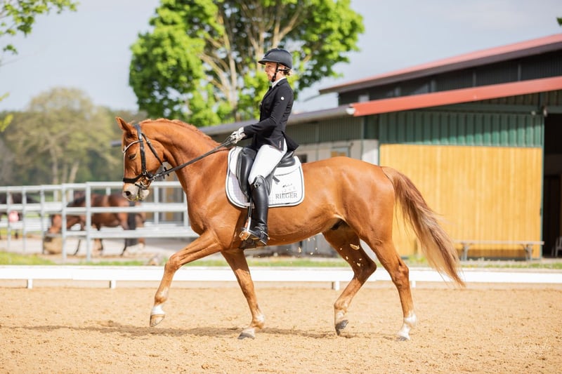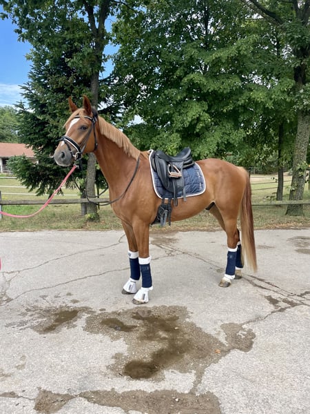 Stunning 6-year-old Hanoverian gelding with excellent basic gaits and an exceptional temperament ✨ Sired by top breeding stallions Escamillo and Dancier. He was backed at four and competed in his first show season in 2024, winning classes in dressage horse A and L. In 2025, he secured victory in dressage horse L and placed in dressage horse M and Kandare L**. His highlight qualities include a lively, elastic trot and an above-average walk. Emilio is an incredible partner in handling—very affectionate and well-behaved, always calm and steady nerves. He is equally comfortable riding alone or in a group in the terrain, performs just as well at competitions as at home, and loads effortlessly into any horse trailer or truck. He is also reliably well-behaved with the farrier and veterinarian. A recent TÜV inspection from 2023 with no findings is available.