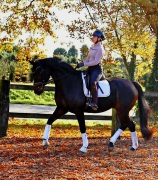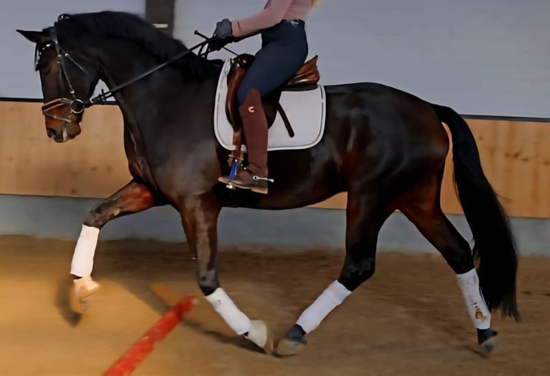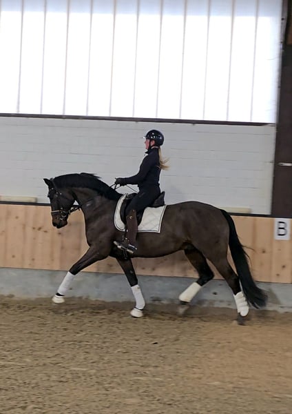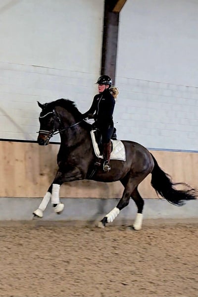 Dieses Bild von einem Pferd zucht seinen Herzensmenschen. VIDEO: https://youtube.com/shorts/F6tv-HCLLJk?is=x7ubM3U0Vv4aGtLi Bereits L platziert überzeugt dieser super schicke Kerl mit 3 sehr guten GGA und einem dem Menschen sehr zugewandten Charakter. Er möchte immer dabei sein und freut sich über jede Art von Zuwendung. Dressurvideo unter: 0177 275 9886 Er ist problemlos in der Box mit täglichem Weidegang zu halten, kennt aber seit seiner Geburt auch Offenstallhaltung. Er kennt Ausritte genau so wie Stangenarbeit und kleine Sprünge. Er wird hier auch mit Pad geritten und macht das sehr artig. Auf dem Video noch ohne Eisen, seit kurzem Beschlagen. Bei seiner Besitzerin war verladen um zur Halle zu fahren an der Tagesordnung.
