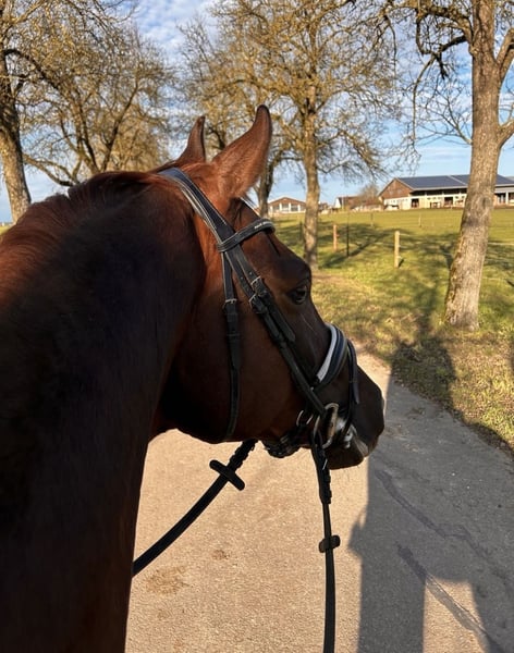 Hannoveraner Wallach, 29.02.2019, Dunkelfuchs, ca. 1,75 m. Romi ist ein sehr lieber, menschenbezogener und aufgeschlossener Wallach. Er wurde von mir selbst ausgebildet und war dieses Jahr noch auf Turnieren unterwegs. Im Umgang ist er brav, unkompliziert und verträglich mit anderen Pferden. Aufgrund eines gesundheitlichen Befundes ist er nicht mehr reitbar und wird daher ausschließlich als Beisteller abgegeben. Er ist schmerzfrei, bewegungsfreudig und genießt den Alltag sehr. Bisher kennt er Boxenhaltung, zeigt sich dabei unkompliziert. Aufgrund seines freundlichen und sozialen Charakters ist eine Umstellung auf Offenstall oder viel Auslauf gut vorstellbar. Gesucht wird ein ruhiges, pferdegerechtes Zuhause mit viel Bewegung. Kein Reitpferd. Bei ernsthaften Interesse freue ich mich über eine Nachricht. Telefonisch bin ich unter der +4917650393776 erreichbar.