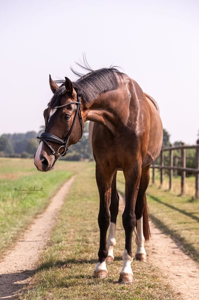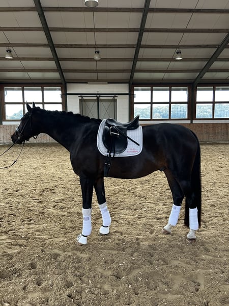 St. Lorenz is an expressive, dark brown Hanoverian gelding who impresses with his remarkable presence. He consistently demonstrates a willingness to perform in daily training, is motivated, and captivates with his clear mind and excellent responsiveness. He is very reliable in his movements and always provides his rider with a pleasant and easy ride. This makes him perfectly suitable for both the ambitious competition rider and those aiming for higher classes. He has been placed multiple times in dressage horse tests at the A level and has also achieved victories. Due to time constraints, he was only presented at a competition once this year, where he was successfully placed in the Dressage Horse L category. He is currently performing at a good Dressage Horse M level and is continuing to develop towards higher classes. In handling, St. Lorenz is absolutely uncomplicated, well-behaved, and always friendly. He is, of course, shoeing and loading tolerant. Due to personal circumstances, this special gelding is now reluctantly for sale. He will only be given to the very best hands. A good veterinary check from March 2023 is available.
