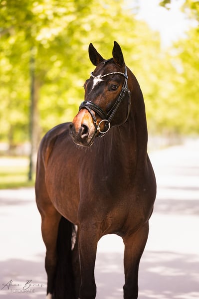 Our stunning Hanoverian gelding, born in 2017, is looking for a new, suitable home. He impresses not only with his elegant exterior and expressive basic gaits but also with his lovable personality. He is trained up to elementary dressage level (LM), consistently demonstrating motivation and eagerness to learn. Under saddle, he presents himself with steady rhythm, good rideability, and a lot of presence in the arena. Despite his friendly and honest nature, he requires an experienced rider who can provide him with confidence and further his development. In handling, he is very well-behaved, affectionate, and always eager to do his best. A horse that will grow beyond expectations with the right owner!
