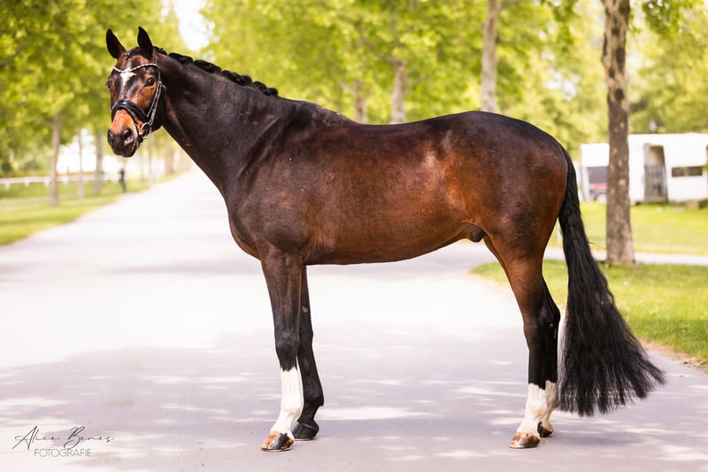 Nasz piękny wałach Hannoveraner z 2017 roku poszukuje nowego, odpowiedniego domu. Oczarowuje nie tylko eleganckim wyglądem i wyrazistymi podstawowymi chódami, ale także swoim kochającym usposobieniem. Jest wytrenowany do poziomu L-M w ujeżdżeniu, zawsze wykazuje motywację i chęć do nauki. Pod siodłem prezentuje się pewnie, rytmicznie i z dużą obecnością w ringach. Pomimo przyjaznego i szczerego charakteru, potrzebuje doświadczonego jeźdźca, który zapewni mu poczucie bezpieczeństwa i będzie go dalej rozwijał. W obsłudze jest bardzo grzeczny, przytulny i zawsze stara się robić wszystko poprawnie. Koń, który z odpowiednią osobą potrafi pokazać, na co go stać!