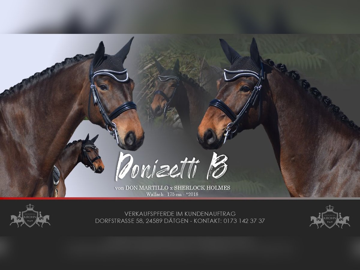 A Reliable Investment and Your Ticket for the FEI Small Tour / S* + S** / PSG + Inter I – Sport-Ready with Great Potential for Grand Prix Level – Suitable for Junior Riders! For sale, on behalf of the owner = breeder, is this impressive, 1.75 m tall, 2018-born (8-year-old) bay Hanoverian gelding by DON MARTILLO x SHERLOCK HOLMES. "Donizetti B" is an exceptional athlete and the perfect combination of power, elegance, and an invaluable character. He is a horse that captivates not only with his presence but also with a flawless competition record. If you are looking for a young horse with proven placings and wins, confidently competing at S-level and with the doors to Grand Prix wide open, this is your chance. SPORTING CAREER: A RECORD FILLED WITH SUCCESS The competitive history of "Donizetti B" is a testament to his quality and consistency. His achievements are thoroughly documented and demonstrate his class at every age: • Young Horse Successes: Placed high in dressage tests for young horses at Class A already at age 4, followed by wins in dressage tests for young horses at Class L as a 5-year-old. Additionally, placed in M-level dressage tests. The Path to the Grand Prix: • 6 years old (2024): Victory in a dressage test at Class M*. • 7 years old (2025): Placed in a Class M** dressage test. • Current training level: He is now firmly established at S** level (FEI Small Tour), making him the perfect partner for an ambitious sport rider. MOVEMENT QUALITY OF THE HIGHEST CLASS & FEI-READY Under saddle, "Donizetti B" demonstrates why he carries the genes of his world champion father, Don Martillo. He is a sport horse with genuine enthusiasm for competition: • Trot: Confidently supported by a well-angled, long-levered, active, and expressive hind leg with plenty of impulsion and shoulder freedom, ensuring self-carriage and an appealing side profile. • Canter: Uphill in build, with ample space and always in natural balance, showing high willingness to collect with a pronounced hind leg footfall. • Walk: Well-regulated, with plenty of rhythm and a good overtrack and clearance. • S** & Grand Prix Perspective: The movements of the Small Tour are well established and reliably performable. The readiness for piaffe and passage is already evident, making him a highly interesting investment for the path to the top levels. A CHARACTER OF GOLD – THE ROCK IN THE SURGE "Donizetti B" is a true gentleman and a real cuddle bug in handling, as well as a cool customer. • Fearless & Calm: In the competition arena, he is a rock-solid partner, performing his lessons with enthusiasm and focus, unaffected by external influences. This makes him the perfect partner for dressage – especially for juniors. • Excellent Junior Suitability: Despite his impressive size, he is a horse that provides confidence to his rider. He forgives mistakes, is easy to handle, and thanks to his excellent rideability, he is the ideal choice for ambitious young riders ready to start immediately in the Grand Prix. A PARTNER FOR LIFE "Donizetti B" is a true exceptional horse. He is an investment in the future, a sport horse with unlimited potential, and a best friend who will stand by his rider through thick and thin. If you are looking for a FEI Small Tour-ready young horse with maximum movement and an invaluable character, this bay will be your heart horse. A current, good clinical and radiological examination (standard + neck + back) is available. After purchase, "Donizetti B" would be very happy to remain with us in professional training for further development and competition, including international FEI events.