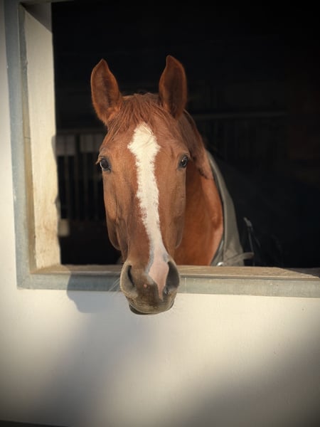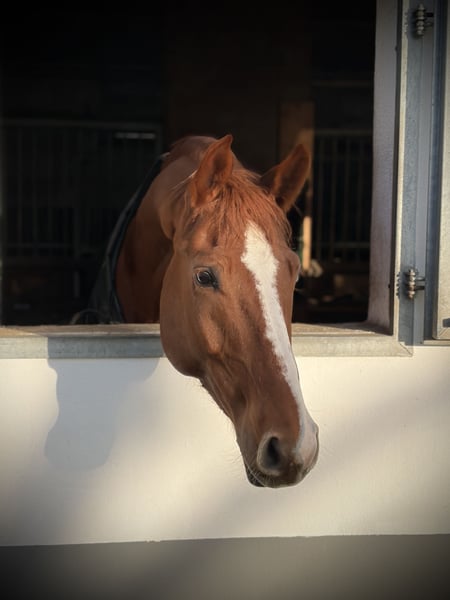 For sale is a stunning 8-year-old Hanoverian chestnut gelding (Vuccello x Chivas) with a lovable temperament. He possesses excellent movement but needs to be ridden regularly and primarily gymnastically trained due to his conformation (he’s the type of horse that looks good from below when it’s standing tall, but not necessarily in motion, so consistent gymnastic work is very important for him). Therefore, despite his gentle nature, he is not being sold as a beginner’s horse. Since he is quite well-behaved both in handling and under saddle, we initially purchased him for our advanced riding school with show jumping ambitions. We were actually looking for a reliable horse for jumping, and we found that in him. He always approaches the jump eagerly, is cautious, and wants to clear the obstacle, which also allows less experienced riders to shine. Unfortunately, it turned out that he is a rather sensitive horse that should be handled with calmness, patience, and understanding in daily work. He needs a consistent handler – frequent changes in riders, especially those still learning to gymnasticize a horse, are not suitable for him. He has already been very successful in competitions, winning both Jumping Horse classes A & L as well as regular L-level show jumping. Anyone who understands how to handle such a horse fairly will find a wonderful friend and sport partner in him. He is accustomed to box stall housing with all-day turnout in a herd, and it is important to us that he can enjoy this in his new home. Important: ❗️We purchased him from a dealer, so we do not know his full history – he was somewhat nervous or skeptical when tied in the stable aisle for grooming, tacking up, etc. ❗️No sales to riding schools.