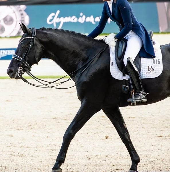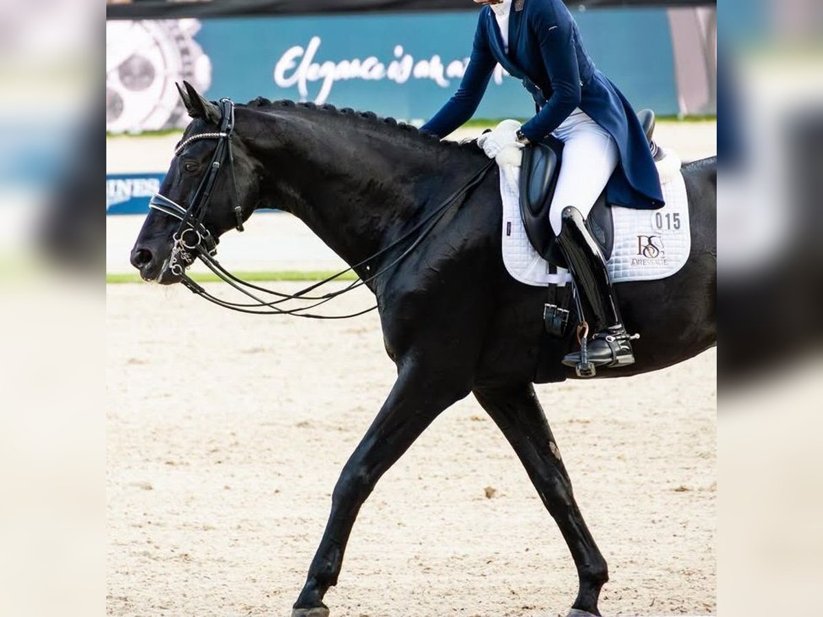 Stunning black Hanoverian gelding, boasting remarkable presence and exceptional quality for dressage. This horse stands out with his harmonious conformation, natural elegance, and charisma, capturing immediate attention both at work and at rest. He demonstrates three expressive and balanced gaits, with a spacious, supple, and rhythmic movement. His walk is regular and elastic, his trot powerful with excellent activity from the hind legs, and his canter uphill, well-balanced, and easy to collect. Possessing great potential for dressage, he shows a strong learning ability, a willing attitude, and excellent understanding of exercises, making him particularly promising for advanced-level competitions. With a pleasant and cooperative temperament, this gelding is respectful, attentive, and easy to handle on a daily basis. He is suitable for both an ambitious rider and an experienced amateur wishing to progress with a quality horse. He has been thoroughly veterinary examined, with a complete health check, recent X-rays, and veterinary reports available—all up to date and compliant. A healthy, well-maintained horse, ready to join a new training or competition program. An exceptional horse combining talent, elegance, and reliability—ideal for a serious dressage project.