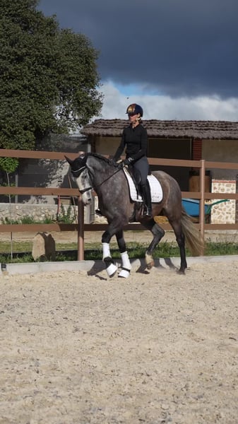 MPREVISTA DE EC, yegua CDE torda nacida el 16/02/2022, criada y entrenada en la Yeguada de Cabo (Colmenar Viejo, Madrid). Domada y trabajando correctamente los tres aires. Pedigrí de calidad: hija de DPOESIA DEL CABO (2018, Dancing Romeo x Poesía Sym/Kaiser XXXII), yegua criada en la propia yeguada, lo que garantiza un seguimiento completo desde su nacimiento. Por línea materna desciende de JECOMIAS CEN, semental PRE aprobado ANCCE con distingión CEN, referencia en cría deportiva española. Una yegua joven, bien formada, con base sólida y proyección real para doma clásica o completo. P