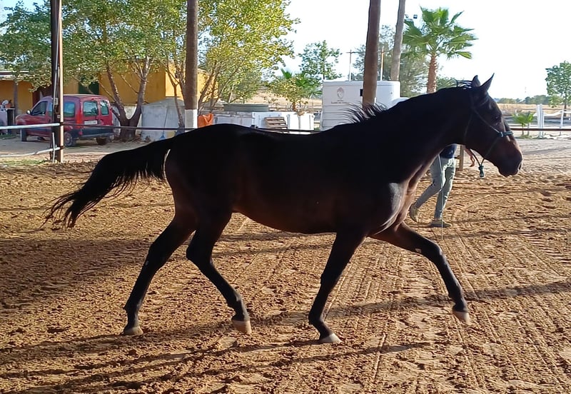 Pouliche très noble, avec de très bons mouvements, idéale pour commencer avec elle et la monter. Débutante uniquement à la longe. Petite-fille de Ministro, un grand cheval maître.