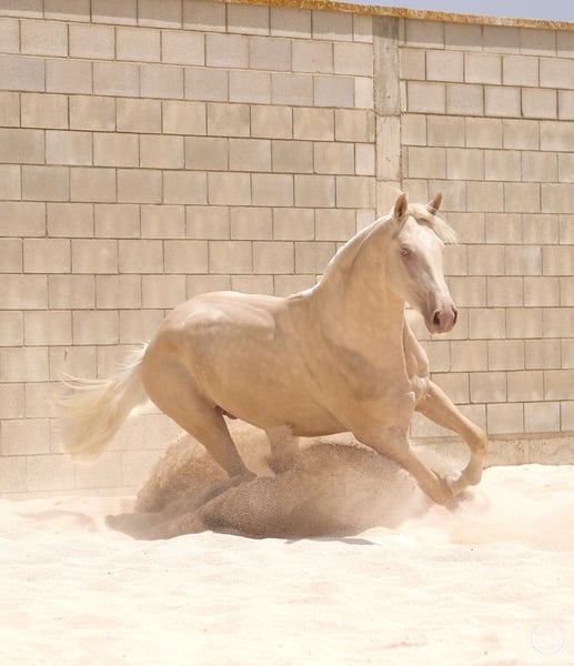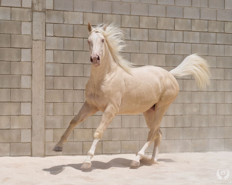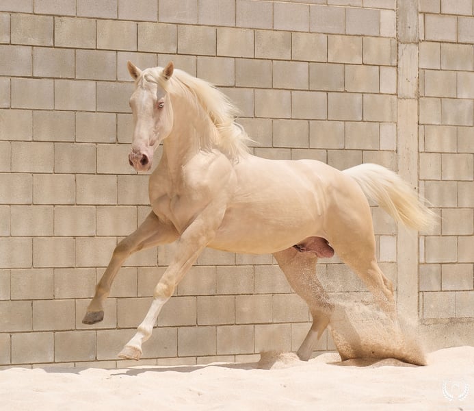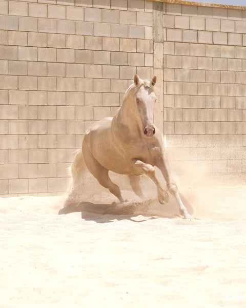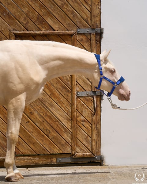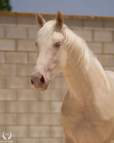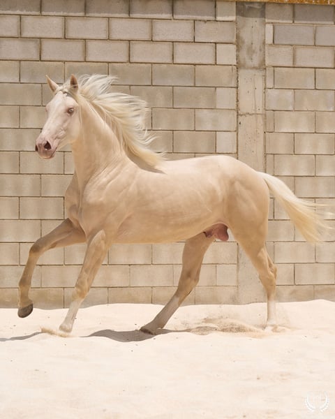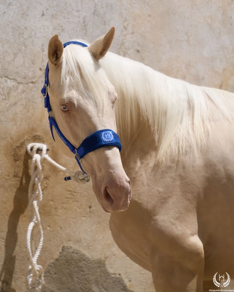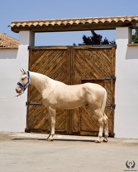 📅 21/04/2023 – CDE registered with ANCADES 🐴 A unique and exceptionally beautiful cremello colt, harmonious and powerful, with three high white socks and sky-blue eyes. Current height: 1.70 m | Expected final height: 1.72 m – 1.75 m Three-white cremello, blonde mane and tail | Excellent conformation, strong back, prominent withers and explosive movement. 🧬 Elite genetics Son of Quest of Gold (palomino CDE) – Las Regueras bloodline Grandson of Quatercream IE x Quarterback | Granddam: Eva, Polish palomino warmblood Cremello genetics (ee CRCR) GUARANTEES → 100% dilute-coloured offspring • With solid mares: palomino, buckskin, smoky black • With dilute mares: cremello, perlino, smoky cream 🧠 Excellent character & handling Basic training: lunging in all three gaits, both reins Easy to handle, good for the farrier, loads and travels well Entire colt with a calm, social and adaptable temperament – never covered 🎯 Versatility & movement Ideal for dressage, show jumping or sport use Big, elastic gaits with good projection A functional young horse with presence, balance and natural nobility ✅ Health guaranteed Excellent pre-purchase X-rays | Veterinary examinations accepted ✈️ National and international transport with professional companies. 📲 Direct contact: +34 639 522 420 📷 Photography: @almarevisual