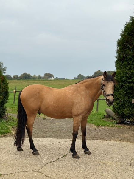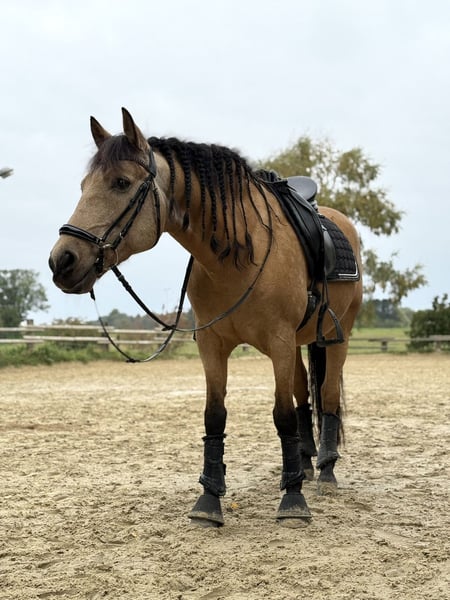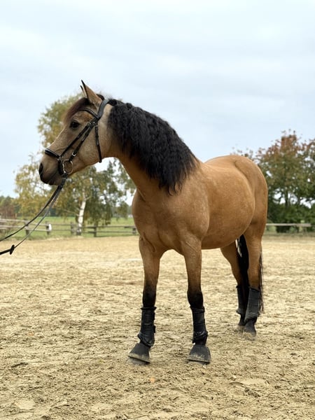 *For inquiries, please contact exclusively at 0171 1177748.* Due to lack of time, this beautiful 14-year-old Spanish gelding with a height of 1.52 meters is for sale. “Dante” is every girl’s dream – stunning, very personable, and well-behaved! The gelding is competing at dressage level A, jumps small fences, is familiar with pole work and trail riding, and enjoys groundwork. Dante can be ridden by less experienced riders (not complete beginners) with side reins, as well as by experienced riders who want to challenge him with new exercises. I can easily see him as a great partner for a mother-child or youth team. He is not mean, but he is not suitable for complete beginners or small children. He also performs tricks such as “giving kisses.” He loves being the center of attention and can be entertained and cuddled for hours. Dante has never been seriously ill with us. He is barefoot, regularly attended by the farrier and dentist, and receives regular vaccinations and deworming. Currently, he is kept in a box with daily turnout on pasture and/or paddock. I could also imagine him in an open stable environment. We wish for Dante to find a 5-star home where he is treated as a family member and loved as much as he is with us. Therefore, priority is given to a suitable home over the price, and some tack and accessories could be included. If you are interested or have questions, and for additional photos and videos, please contact us exclusively by phone or WhatsApp at 0171 1177748. Dante is looking forward to meeting you :)