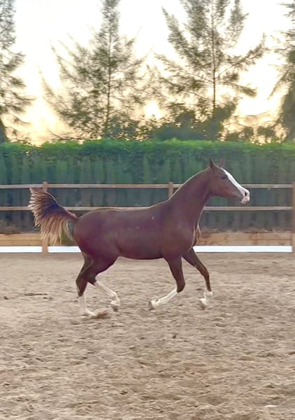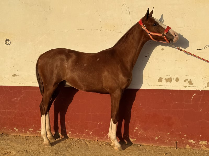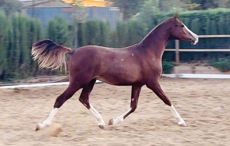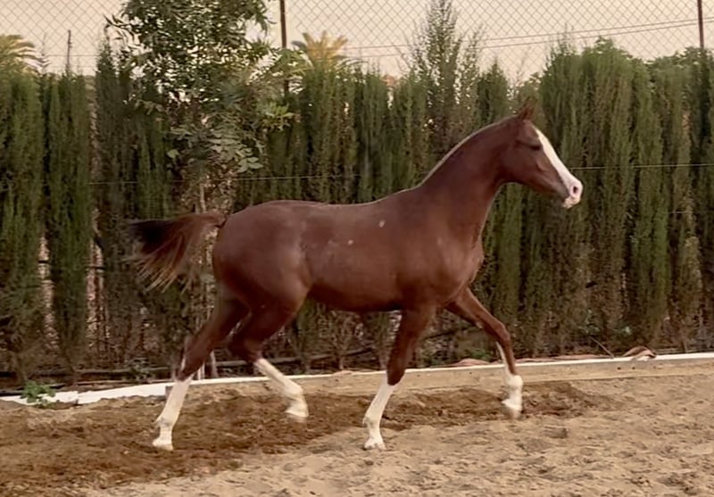 Potro de 2024 alazán y cuatralbo, árabe hamnoveriano, cuatralbo, excelente carácter.