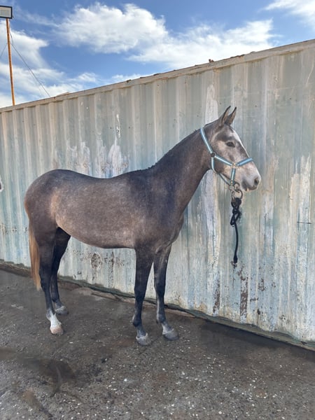 Potro CDE, con 30 meses, noble y dando cuerda con el filete y montura sin ningún tipo de problema. Se deja coger manos y pies. Su padre es un caballo lusitano con hannoveriano siendo este hijo de santano caballo de Javier bolao y su madre una yegua española que viene por tesoro semental de la yeguada militar.