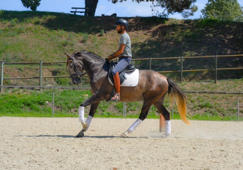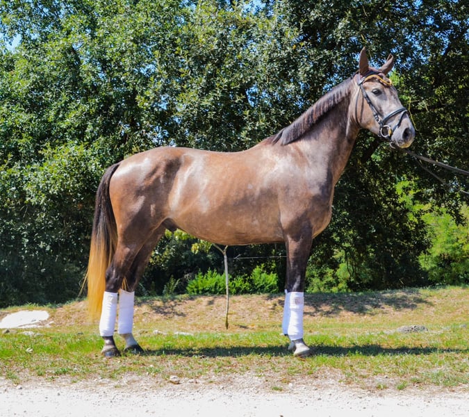 CDE 75% Pre, 25% KWPN, 4 years old, will turn 5 in 2026. Castrated, height: 1.58 m. Bitted and ridden, performs walk, trot, and canter on the arena, well-behaved and responsive, with good contact. Slightly jumping, progressing well in the field, and started in lunging on a long rein. The sire excels in jumping and dressage, currently competing in both disciplines.