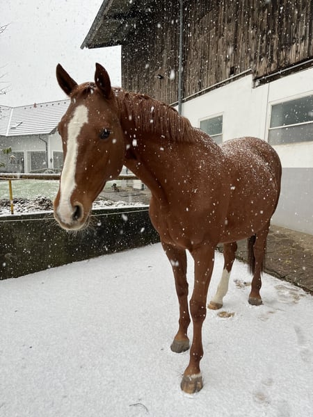 This stylish mare by Uriko x Caretino x Rebel Z is searching for her 100% soulmate. I personally trained her from the age of four, and she has competed up to 1.20 meters in show jumping. She is capable of performing all elementary dressage movements. Due to her strong ambition, she often appears tense and stressed during work in the arena. Her greatest passion is the outdoors. She loves hacking out and is very reliable in the field. She crosses any water, goes over bridges, and is familiar with all kinds of construction machinery, trucks, and agricultural equipment, always remaining calm and composed. She is easy to load alone, stands patiently at the blacksmith (currently being shod with hot shoes), and is accustomed to stable life. She has almost always been turned out full-time on pasture since she was a foal. She previously had a beautiful foal by Keaton, making her also interesting for breeding purposes. She is registered as a broodmare in Austria. Currently, she is ridden by a 12-year-old girl during riding lessons, where she tries her best but can sometimes become a bit wild. "Abby" lives with me on the farm. Unfortunately, we are two very different characters and just can't seem to connect. She deserves a person who appreciates her quite independent nature. It is ONLY the right environment and the right person that matter, not the price.