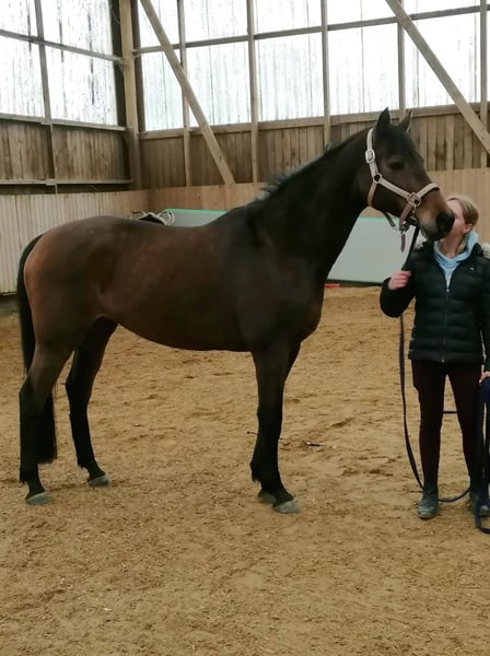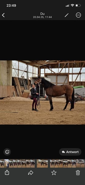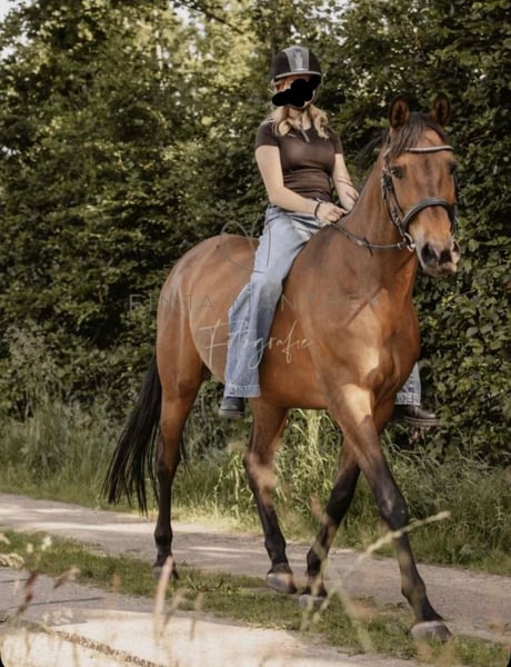 Hermine, 1,58m, 18 Jahre, ist von einem 13 jährigen, zierlichen Mädchen freizeitmäßig geritten. Hauptsächlich im Gelände, aber sie kennt auch die Arbeit in der Halle, unter dem Sattel und Bodenarbeit. Sie hat ein gut händelbares Temperament, deshalb für Reiter mit fortgeschrittenen Reitkenntnissen. Schmiede- und verladefromm. Mit komplettem , passendem Zubehör.
