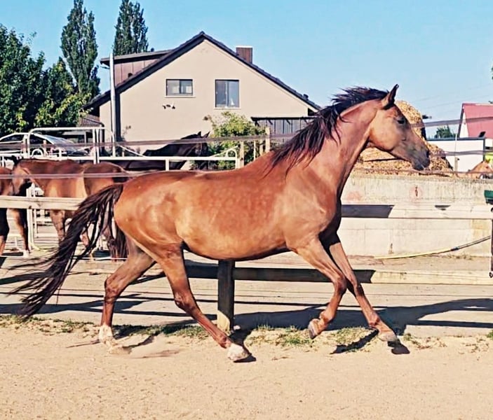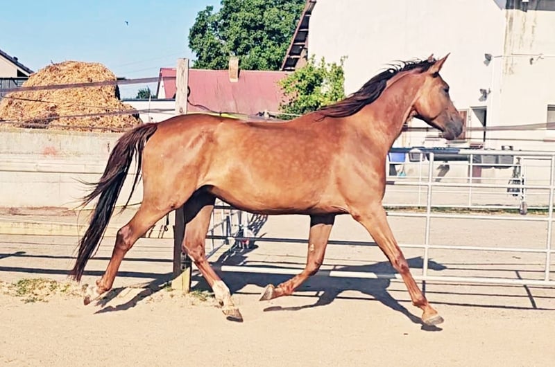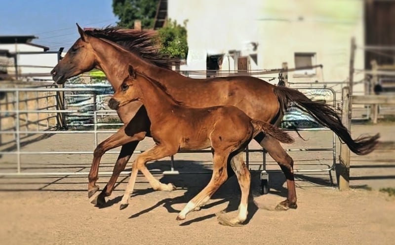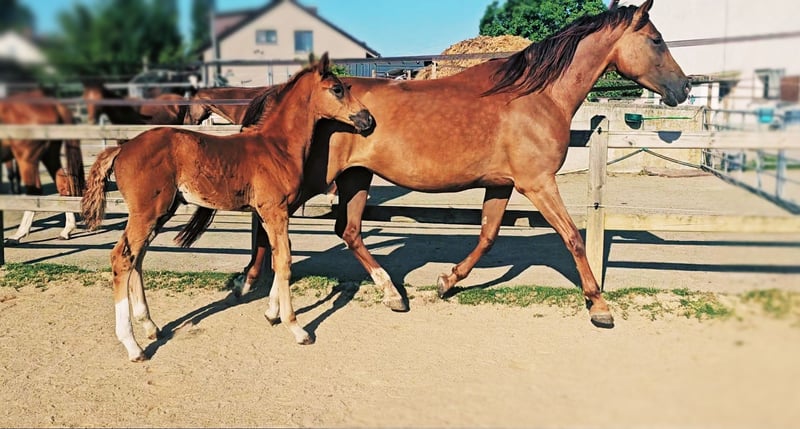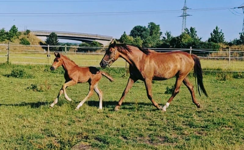 For sale solely due to the breeder's illness and the discontinuation of breeding (Only in loving, appreciative hands and in a first-class home) - 5-year-old Holsteiner mare - Dark chestnut roan (only roan markings, not a gray!) - Already awarded as a foal - Both parents successfully competed up to the highest level in dressage and show jumping Top pedigree Paternal lineage: Topas - Totilas - Gribaldi - Sandro Hit - Sandro Song Maternal lineage: Carano × Capitol 1 - Corrado 1 - Cor de la Bryere - The mare has never been injured or ill - Stable foundation and strong joints - Currently being backed (late due to her size) - Had her first very good foal at the age of 4 (last picture in the gallery) as a foundation for her later post-sport retirement - Currently has her second very well-developed foal at foot - She is now to start her sporting career lightly after weaning for the next season - Well socialized (mixed-age, gender-separated herd management 24/7 outdoors) - Knows the stable - Highly interesting for breeding, insemination, pregnancies, and births without issues - Excellent basic gaits - Super clear-headed (passes this on to her offspring) - Top temperament, absolutely relaxed when being backed - Very decent in handling and interaction - Sale can also be offered as a package with this year's colt foal at special conditions Videos available upon request in personal contact! Current vet check can be done at any time at the buyer's expense. Costs for significant deficiencies will be covered by the seller.