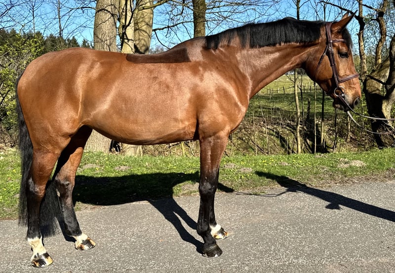 Good Oersdorfs Miley was born and raised with us. She is a versatile and well-rounded riding horse, consistently and thoughtfully trained. Whether during daily groundwork, show jumping practice, trail riding, gallop training, or simply enjoying leisure rides, Miley is always a wonderful partner for her rider. She has also gained competition experience, so unfamiliar environments are no problem for her. We believe Miley is best suited for a rider looking for a reliable partner who is open to various disciplines, as she enjoys tackling different tasks with her rider. Her pedigree is particularly impressive and will appeal to breeders; her dam line is especially interesting. Her sire, Comme il faut, won gold at the Olympic Games in show jumping, and Miley’s dam was highly successful in jumping up to S level. All her foals have received a foal premium. Due to a rider’s extended stay abroad and the resulting reduction in herd size, Miley is only being sold to a suitable, caring home. A three-year breeding evaluation with minor findings is available. Further information about Miley is also available by phone at 0173 9171091.
