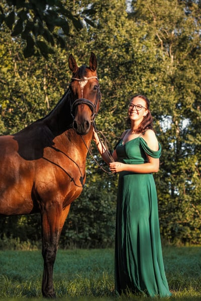 Zum Verkauf steht eine beeindruckende Holsteiner Stute, geboren im Jahr 2018. Mit einer Größe von ca. 173 cm ist sie sowohl optisch als auch zukünftig sportlich eine echte Bereicherung. Diese springgezogene Stute überzeugt durch ihre solide Grundausbildung, ihre Arbeitswilligkeit und ihrem Charakter aus Gold. Cornelia wurde im Frühjahr 2024 schonend angeritten, war danach für drei Monate in Beritt und seither habe ich sie freizeitmäßig geritten in der Dressur und bin auf Lehrgänge gefahren. Sie zeigt eine gute Motivation bei der Arbeit, ist aufmerksam und lernwillig, was sie zu einer vielversprechenden Partnerin für den Freizeitreiter, ambitionierten Freizeitreiter und dem Sport macht. Dank ihres ausgeglichenen Charakters ist sie sowohl im Training als auch in der täglichen Arbeit angenehm im Umgang. Ausritte allein oder in der Gruppe sind kein Problem. Sie führte bereits größere Ausritte mit Kutschen, Kremsern und vielen weiteren Reitern mutig an. Durch ihre Gelassenheit und Klarheit im Kopf kann man mit ihr viel Spaß im Gelände haben oder einfach mal die Seele baumeln lassen. Cornelia hat das Potenzial für den Sport und bietet sich möglicherweise auch für die Vielseitigkeit an. Ein echtes Talent, das mit der richtigen Förderung noch viel erreichen kann. Auch für die Zucht ist sie sehr interessant und hatte bereits 2 Fohlen (beim Züchter selbst). Cornelia würde inklusive ihres Zubehörs verkauft werden: (oben genannter Preis ist inkl. Zubehör) - neuer Kentauer Springsattel - Trense - Vorderzeug - Gamaschen - Decken etc. Cornelia ist mein größter Schatz und es fällt mir unglaublich schwer sie herzugeben. Aber Liebe darf nicht zu Egoismus werden. Daher ist mir ein liebevolles und förderndes zu Hause sehr wichtig. Wenn Cornelia dein Interesse geweckt hat, dann melde dich doch sehr gern.