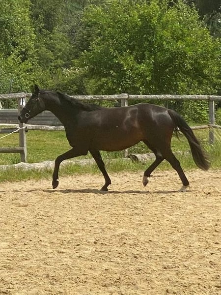 Very sweet and good-natured black mare with full Holsteiner breeding papers. She has given birth to a very nice black foal with us. Unfortunately, she is not fully load-bearing due to a condition called "Durchtrittigkeit" (overreaching). Therefore, she is ideal as a companion and leisure horse.