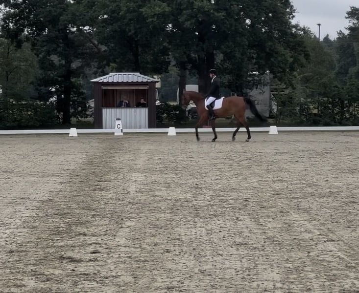Ivy 9-jährige (ca 167 cm) Holsteiner Stute von Hermes de Lux x Aloube Z Ivy ist dieses Jahr VL und CCI 2* platziert. Ivy hatte 5 j. ein Hengstfohlen von Central Park, welches über den OS-Verband mit Eliteauszeichnung versehen wurde. Ihr jetzt 4 j. Nachwuchs kann gerne bei mir angeguckt werden. Ivy ist von mir selbst gezogen (Mutter lief mit mir bis S-Springen) und nur als Fohlen in einer Fohlengruppe gewesen. Ende 2 j. ist Ivy dann zu mir gekommen. Dadurch ist Ivy erst 6 j. Auf Turnier vorgestellt worden und eigentlich als reines Springpferd ausgebildet worden. Durch einen Zufall sind wir dann in der Vielseitigkeit gelandet, so dass Ivy Ende 8 j. ihre erste VS lief. Ihre Stärke liegt in der VS im Springen. Da ist uns dieses Jahr kein Springfehler unterlaufen und konnten somit das mittelmäßige Dressurergebnis etwas ausgleichen (haben aber auch schon eine 36er Dressur geritten). Dressur ist aber auch nicht meine Paradedisziplin. Im Gelände sollte Ivy sportlich geritten werden. Ideal wäre ein/e Junior/in die z.b. vom Pony auf Pferd umsteigen möchte oder zweigleisig fahren möchte und so mit Ivy zusammenwachsen könnte. Im Winter läuft Ivy barfuß und nur während der VS-Saison mit vier Eisen. Bei ernsthaften Interesse verschicke ich gerne ein Video. Preis: 32.000 €