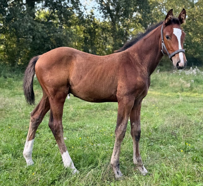 Holsteiner colt by Stanley x Stanfour / Canturo / Colman from a highly successful dam line. Stanlee is a very long-legged, handsome, and well-marked colt sired by Stanley out of our Farena. He is a stallion with a strong individual recognition factor, an elegant head, and excellent basic gaits. His dam, Farena, is a daughter of Stanfour / Canturo / Colman / Corofino I / Lord from the Holsteiner Stamm 1223 and sister to the mare Chanel BS, who competes successfully at 1.45 m level internationally with Ann-Sophie Seidl. In the immediate maternal line, there are internationally successful and winning names at 1.60 m level, such as Sir Sandro BS (Steffen Eikenkötter), Best of Berlin BS (Edwin Smits), and the licensed stallion Number One (Maksymilian Wechta), who was recently licensed in Westphalia and already successful at 1.40 m level with Dryad BS (Steffen Eikenkötter). Dryad BS also belongs to Farena’s direct maternal line. The powerful jumping sire Stanley is a Hanoverian Grand Prix winner, descending from Stakkato / Loredo / Graphit / Gotthard. With Eva Bitter, he won the Hanoverian Show Jumping Championship in Verden and took victory in the small final of the Bundeschampionat in Warendorf. Stanley also has offspring successful at international 1.60 m level. Additionally, he has produced numerous high-priced progeny sold at riding horse and foal auctions. He is renowned for passing on his exceptional rideability and honest character to his descendants. Stanley has been consistently ranked among the top in the FN breeding value evaluations for young horse competitions for years.