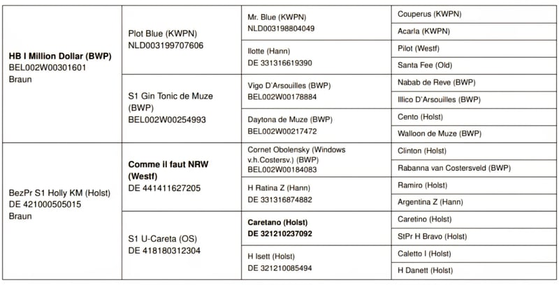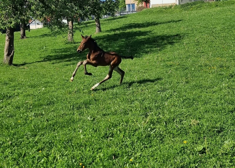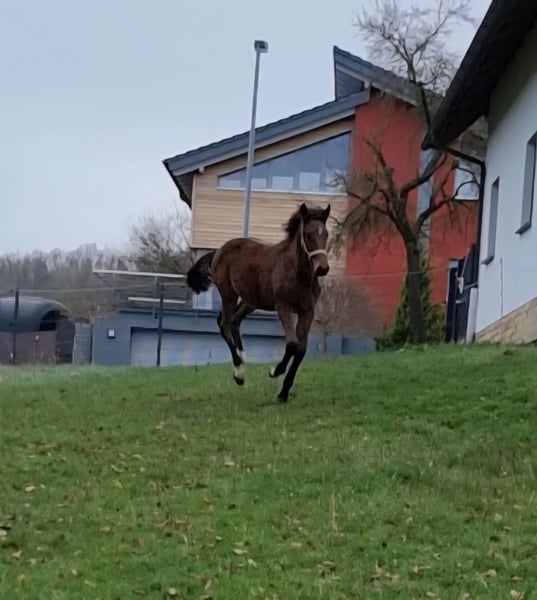 Angeboten wird ein prämierter, bildschöner, ausdrucks- und bewegungsstarker Holsteiner Hengst von Million Dollar x Comme il faut x Caretano aus dem Stamm 104A. Aus der Ururgroßmutter Danett entstammen die gekörten Hengste Alcatraz (von Accord II), Amidou (von Alkatraz), WT Lillix (von LioCalyon) und WT Lakota (von LioCalyon) mit Drew Weber. Die Urgroßmutter Isett brachte die Springpferde Quicky H (von Quick Star) mit Tina Deuerer, Campino H 2 (von Calato) mit Petra Püttmer, Casino Royale 17 (von Calato) mit Dr. Dominik Roeder, Cendrillon Marron (von Coriano) mit Josefine Martinello, Zalazar D (von Zinedine) mit Noa Ben Zeev und Victoria D (von Vagabond de la Pomme) mit Tamina Seibold. Aus der hochinteressant gezogenen (8x Ramzes AA) und fruchtbaren Großmutter U-Careta entstammen inzwischen 9 Pferde, darunter die in der Vielseitigkeit in den USA sehr erfolgreichen Friday (von Chin Champ) mit Adisso Hagan und Clueso (von Clarimo) mit Maya Clarkson. Weitere Nachkommen haben in Schweden und Spanien ihren Stall gefunden. Die Mutter Holly KM musste wegen einer Verletzung bereits früh in die Zucht wechseln. Sie erhielt eine Bezirksprämie und brachte bislang 5 Fohlen, 4 davon sind prämiert. Die älteren Geschwister zeigen sich im Umgang durchweg freundlich, aufgeschlossen und zuverlässig. Das Pedigree des Vaters Million Dollar ist von sporterprobter Leistungsfähigkeit in seltener Konzentration geprägt. Sein Vater Plot Blue war Goldmedaillengewinner (Team) der Weltreiterspiele 2010 in Lexington, Sieger des Weltcup-Finales 2010 und Sieger des Top Ten-Finales 2009. Sein Großvater Vigo d’Arsouilles war 2010 siegreich in der Einzelwertung der Weltreiterspiele in Lexington und sein Urgroßvater Cento war Mannschafts-Goldmedaillengewinner der Olympischen Spiele in Sydney, Sieger des Weltcup-Finales in Leipzig und Sieger im Großen Preis von Aachen. weitere Informationen zum Vater finden Sie unter: https://www.holsteiner-verband.de/de/hengsthaltung/hengste/pferd/million-dollar-bwp Der Jährling ist artig und gut zu händeln (kennt Halfter, Hufschmied, Kinder, Haustiere, Trecker, Tierarzt, Wurmkur usw.) und kann bei Interesse gern besichtigt werden. Transport nach Absprache möglich. Videos und weitere Informationen auf Anfrage.