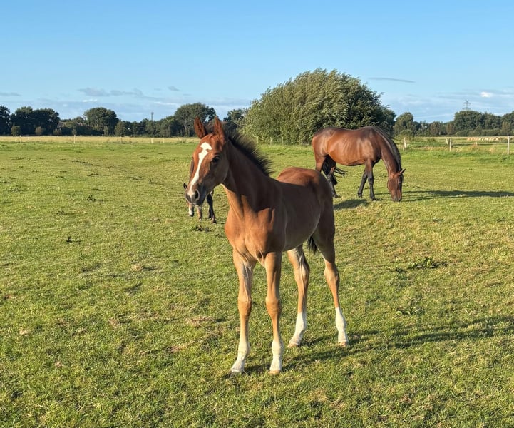 For sale is a colt by Ermitage Kalone (Catoki x Kannan) out of a Holsteiner mare by Nekton x Landgraf x Calypso x Ramiro, Stamm 776. The mother passes on a lot of rideability and willingness to perform and has already produced a licensed son. Ermitage Kalone himself has been making waves in international show jumping for years with his rider Gilles Thomas, achieving numerous victories and placements at 5-star level. The foal is equipped with fantastic basic gaits, impresses with an impeccable character, and was born in early June. For further questions, please feel free to call: 0160-96436624.