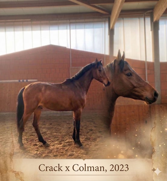Beautiful 3-year-old stallion by Crack x Colman for sale. This charming young stallion impresses not only with his attractive appearance but also with his consistently good temperament and positive demeanor. He is always in good spirits, easy to handle, and ready for his future role. As a young, untrained horse, he possesses excellent potential for further development. With his attitude and talent, he will undoubtedly bring his future rider a great deal of joy. Additional information or viewing available upon request.
